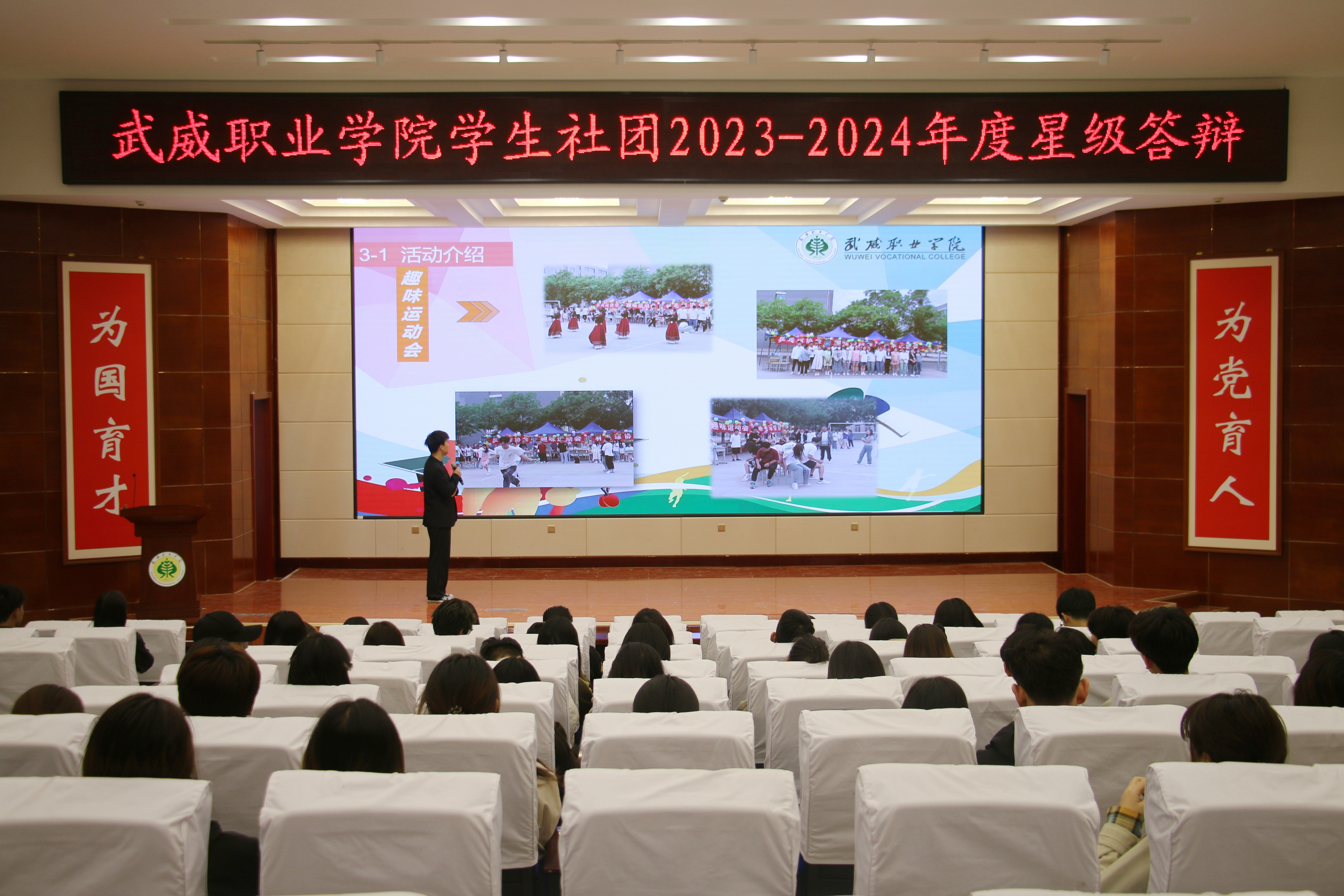 4月12日,學(xué)校在菁英廳舉辦了2023年度學(xué)生社團(tuán)星級(jí)答辯會(huì)。答辯現(xiàn)場(chǎng),各學(xué)生社團(tuán)負(fù)責(zé)人通過PPT介紹了從基本情況、活動(dòng)開展、品牌創(chuàng)新以及未來規(guī)劃等方面進(jìn)行答辯展示。其中,新思想學(xué)習(xí)社、大學(xué)生攻鼓子藝術(shù)團(tuán)等思想引領(lǐng)類社團(tuán)展示了文化沙龍、藝術(shù)展演等活動(dòng)情況;藍(lán)天愛心協(xié)會(huì)、大學(xué)生就業(yè)創(chuàng)業(yè)促進(jìn)會(huì)等素質(zhì)拓展型社團(tuán)展示了愛心幫扶、就業(yè)創(chuàng)業(yè)等活動(dòng);青春健康同伴社、心翼心理協(xié)會(huì)等健康類社團(tuán)展示了健康防艾、心理咨詢等特色活動(dòng);朝陽武術(shù)協(xié)會(huì)、羽毛球協(xié)會(huì)、乒乓球協(xié)會(huì)等體育競(jìng)技類社團(tuán)展示了促進(jìn)大學(xué)生健康和興趣培養(yǎng)方面的體育文化活動(dòng)。最后,通過現(xiàn)場(chǎng)答辯、審核資料、社團(tuán)互評(píng)等方面綜合考量,評(píng)選出五星級(jí)學(xué)生社團(tuán)2個(gè),四星級(jí)學(xué)生社團(tuán)4個(gè),三星級(jí)社團(tuán)6個(gè)。
