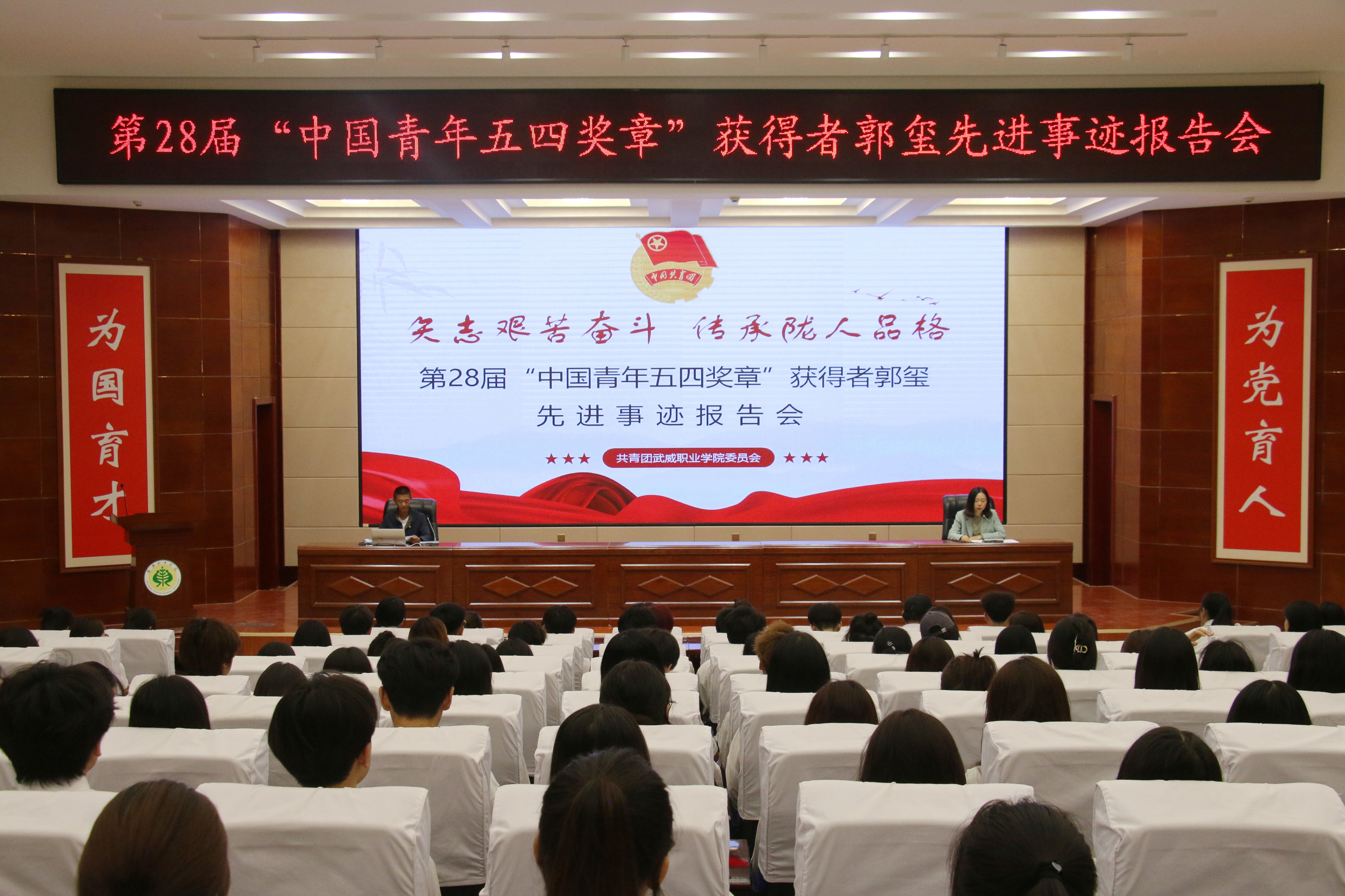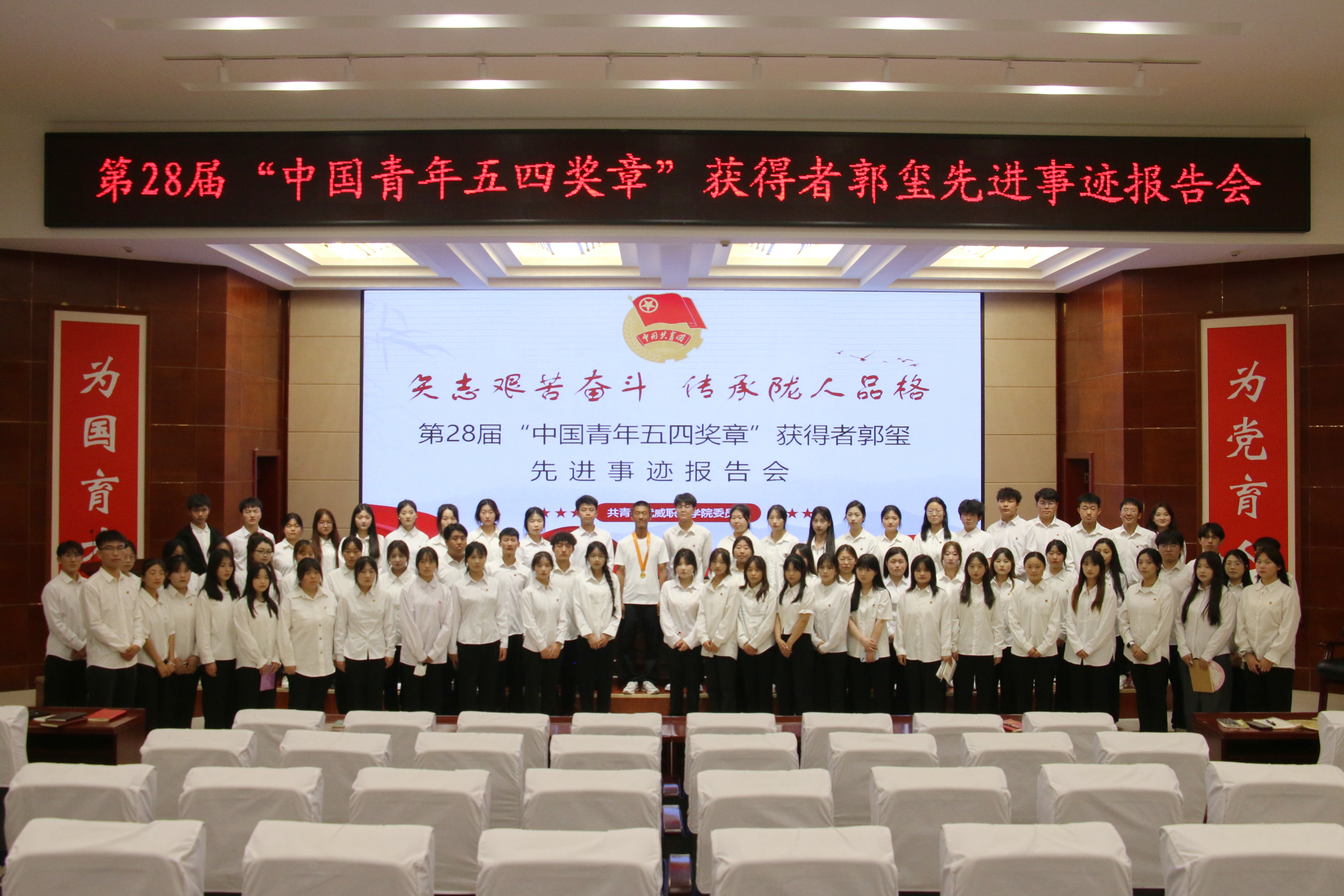 為進(jìn)一步引導(dǎo)和激勵(lì)團(tuán)員青年踔厲奮發(fā)、篤行不怠,厚植奮斗底色,5月24日,學(xué)校在菁英廳舉行“矢志艱苦奮斗傳承隴人品格”第28屆“中國(guó)青年五四獎(jiǎng)?wù)隆眰€(gè)人先進(jìn)事跡報(bào)告會(huì)。學(xué)校邀請(qǐng)第28屆“中國(guó)青年五四獎(jiǎng)?wù)隆鲍@得者——郭璽同志出席活動(dòng),并作了“三代青春鑄綠洲”主題宣講報(bào)告。學(xué)?!扒囫R工程”培訓(xùn)班學(xué)員、優(yōu)秀學(xué)生代表共計(jì)220余人參加報(bào)告會(huì)。會(huì)議由團(tuán)委副書記謝麗霞主持。