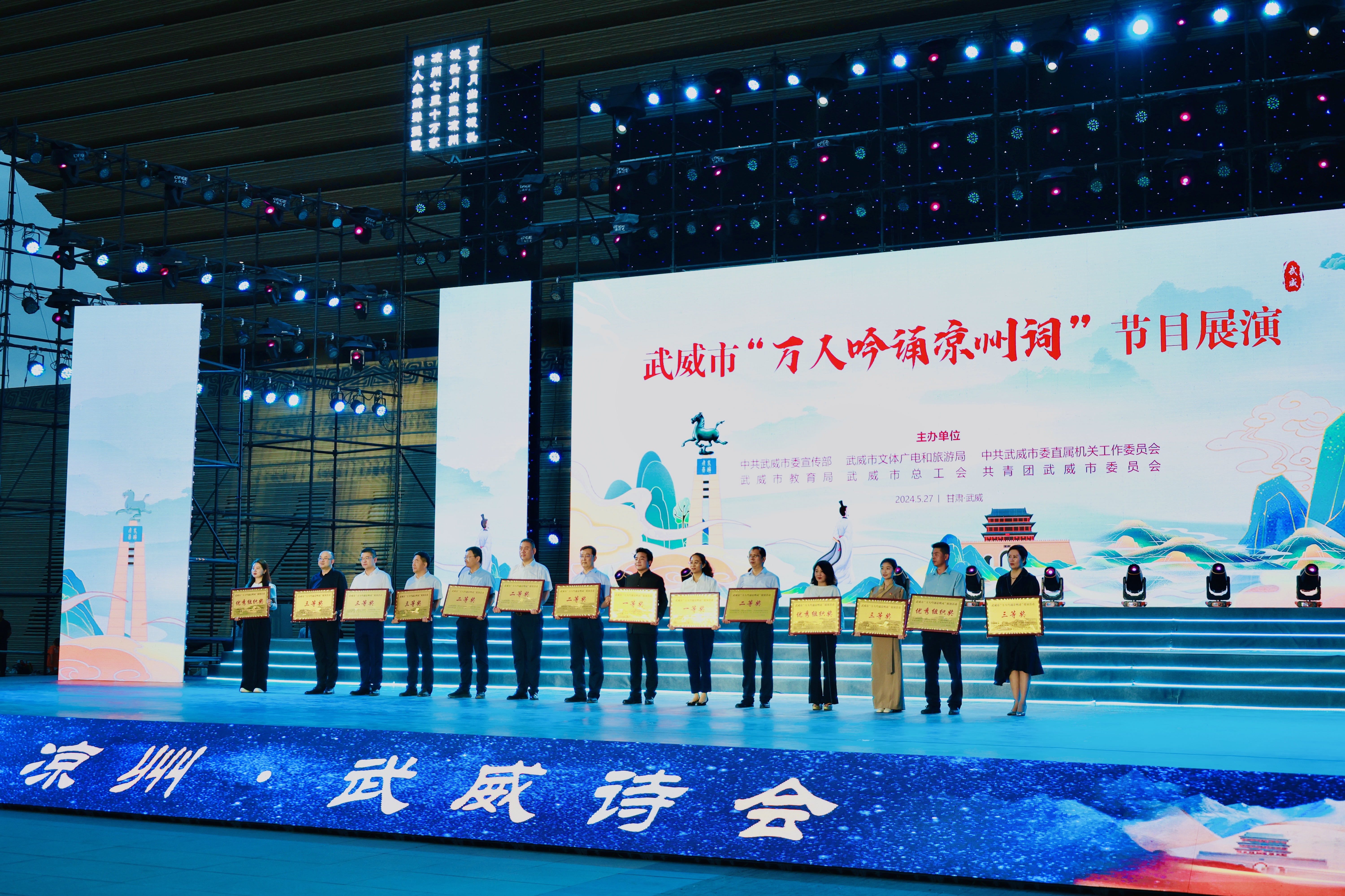 5月27日晚,武威市“萬(wàn)人吟誦涼州詞”優(yōu)秀節(jié)目展演活動(dòng)在漢唐天馬城大漢賦館前舉行,并為“萬(wàn)人吟誦涼州詞”比賽中的優(yōu)秀作品頒獎(jiǎng)。學(xué)校選送的節(jié)目《詩(shī)意涼州·迤邐踏歌》在15個(gè)展演節(jié)目中榮獲一等獎(jiǎng)。