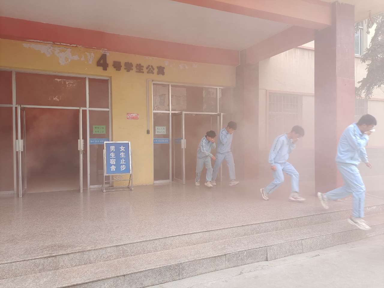 14時(shí)40分,疏散演練正式開(kāi)始。隨著火災(zāi)警報(bào)響起,各學(xué)生公寓樓冒出滾滾濃煙,公寓管理人員迅速組織學(xué)生有序疏散。在軍訓(xùn)教官、學(xué)生管理人員的引導(dǎo)下,同學(xué)們按照動(dòng)作要領(lǐng),用濕毛巾捂住口鼻,俯身彎腰按照安全出口指示牌指引快速、有序從疏散通道撤離到體育場(chǎng),整個(gè)過(guò)程緊張有序、實(shí)用性強(qiáng),收到了預(yù)期效果。