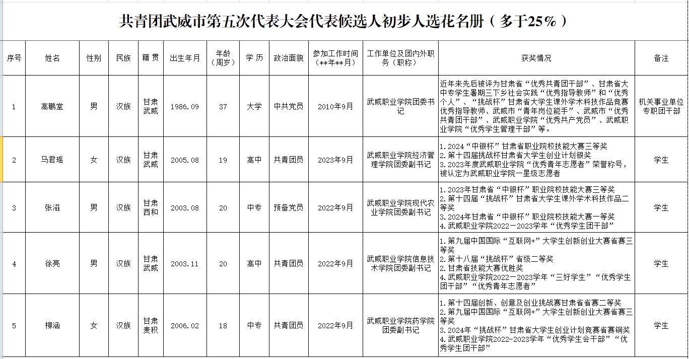 關(guān)于共青團(tuán)武威市第五次代表大會(huì)代表候選人初步人選考察情況的公示