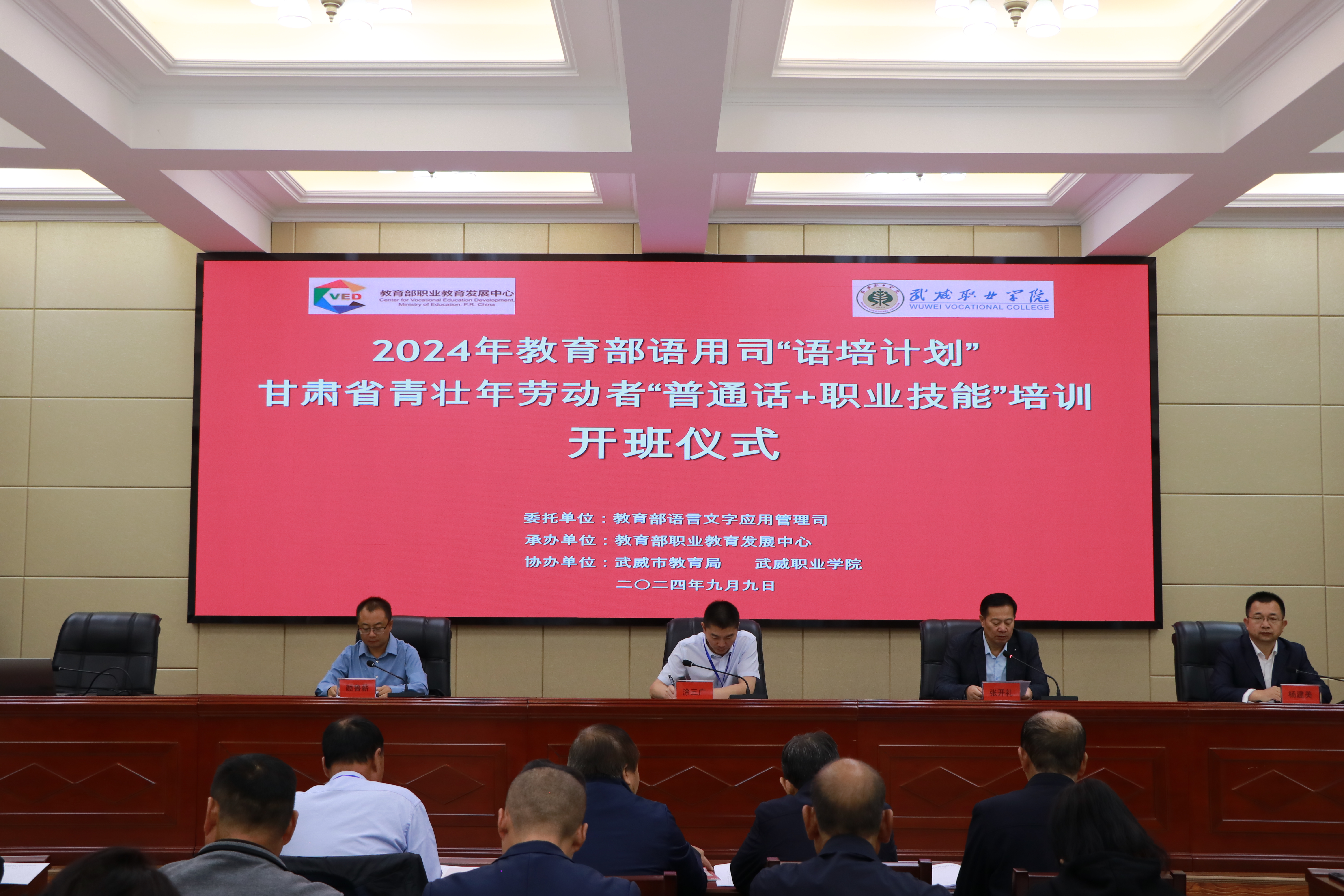 9月9日上午,2024年教育部語用司“語培計劃”甘肅省青壯年勞動者“普通話+職業(yè)技能”培訓(xùn)班在我校正式開班。本次培訓(xùn)是深入貫徹黨的二十大精神和二十屆三中全會精神,根據(jù)教育部語用司《關(guān)于實施2024年國家通用語言文字示范性培訓(xùn)計劃的通知》,受教育部語用司委托,由教育部職業(yè)教育發(fā)展中心承辦、武威市教育局、學(xué)校共同協(xié)辦。本次培訓(xùn)為期5天,共有來自武威市三縣一區(qū)的50余名學(xué)員參加。培訓(xùn)以“語言鋪路,技能致富”為主題,培訓(xùn)內(nèi)容聚焦當(dāng)?shù)剞r(nóng)業(yè)種植技術(shù)技能和畜牧業(yè)養(yǎng)殖技能開展,以古浪“紅禿頭”小麥、民勤蜜瓜等特色農(nóng)產(chǎn)品的栽培養(yǎng)殖技術(shù)為主線,設(shè)計了“普通話+職業(yè)技能”為主題的課程內(nèi)容,邀請了國家級普通話測試員、甘肅省農(nóng)業(yè)科學(xué)院專家、武威市農(nóng)科所專家等組成的專家團隊。