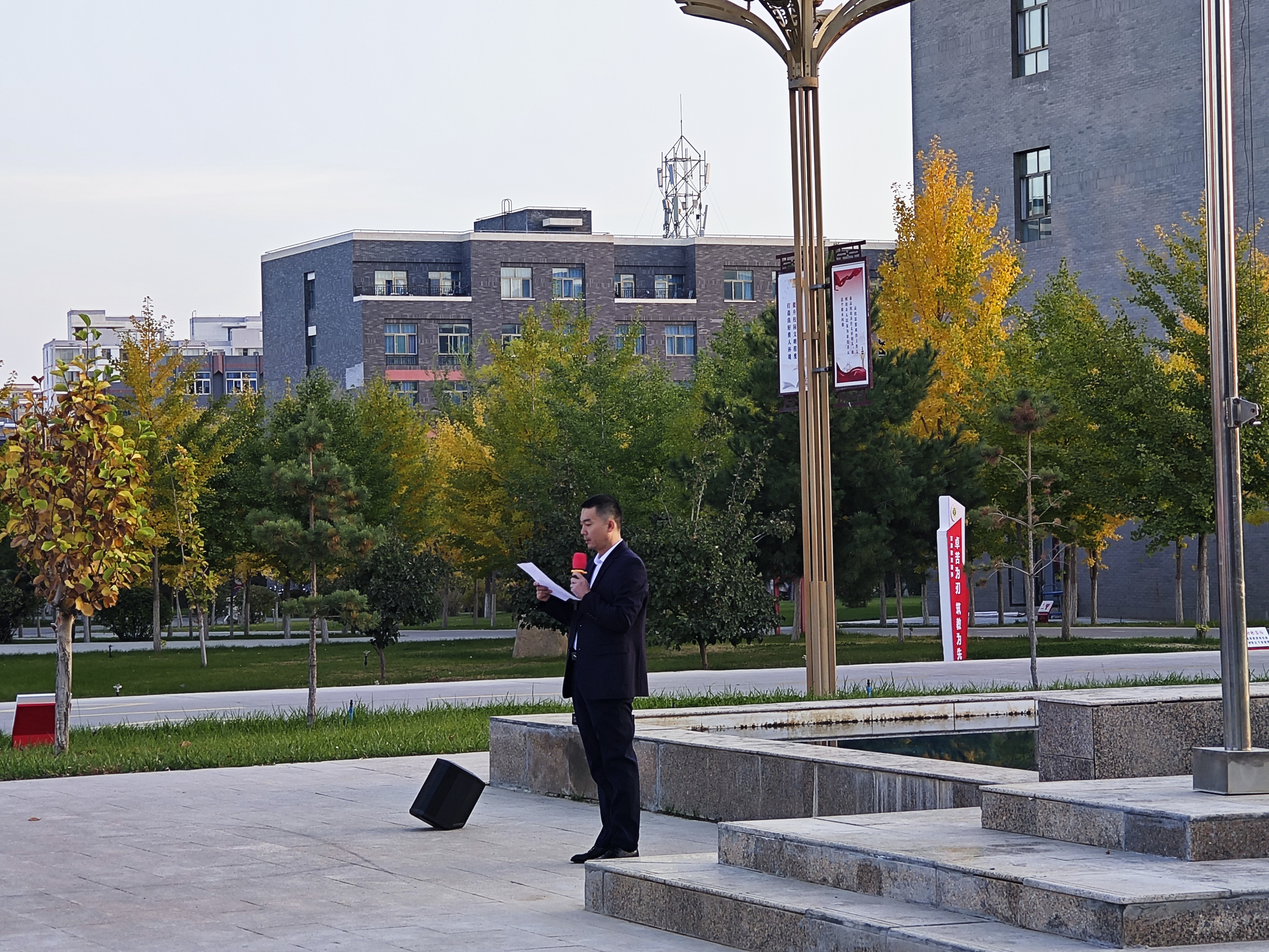 10月14日,信息技術(shù)學(xué)院在圖書館廣場舉行升國旗儀式。學(xué)院黨總支書記史子新及全體師生參加。