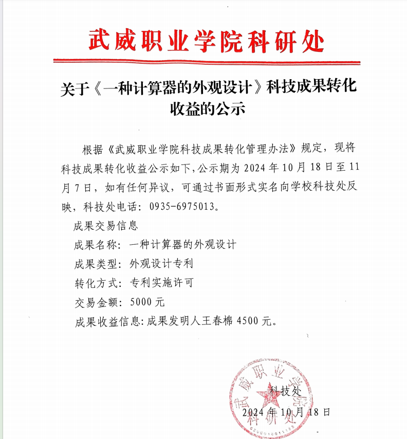 關(guān)于《一種計算器的外觀設(shè)計》科技成果轉(zhuǎn)化收益的公示