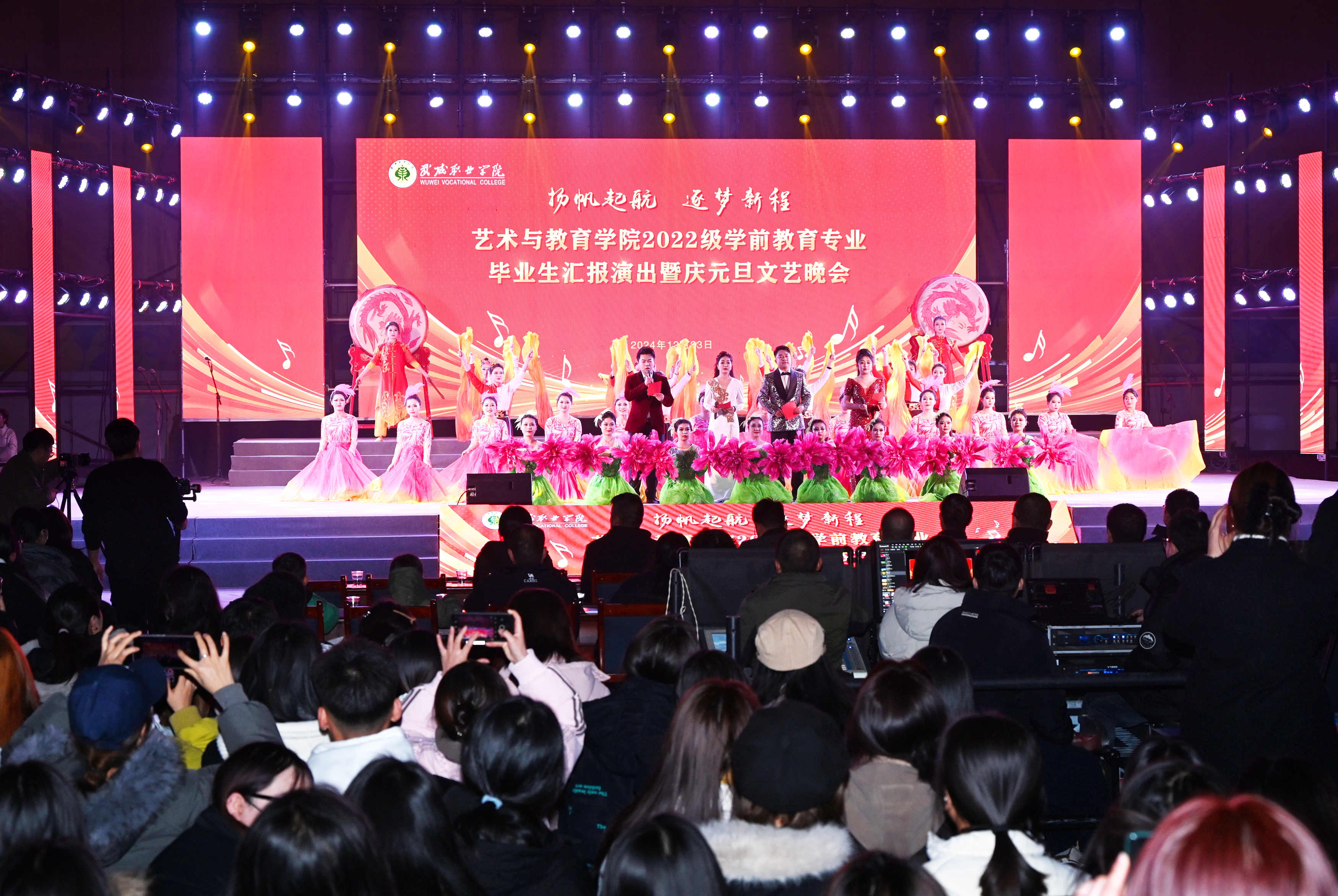歲序常易,華章日新。2024年12月23日晚,藝術與教育學院2022級學前教育專業(yè)畢業(yè)生匯報演出暨慶元旦文藝晚會在學校體育館隆重舉行,學校校長李海軍,黨委副書記、副校長張開禮,黨委委員、副校長王守云出席晚會。學校各部門、二級學院負責人及師生2000余人觀看了演出。