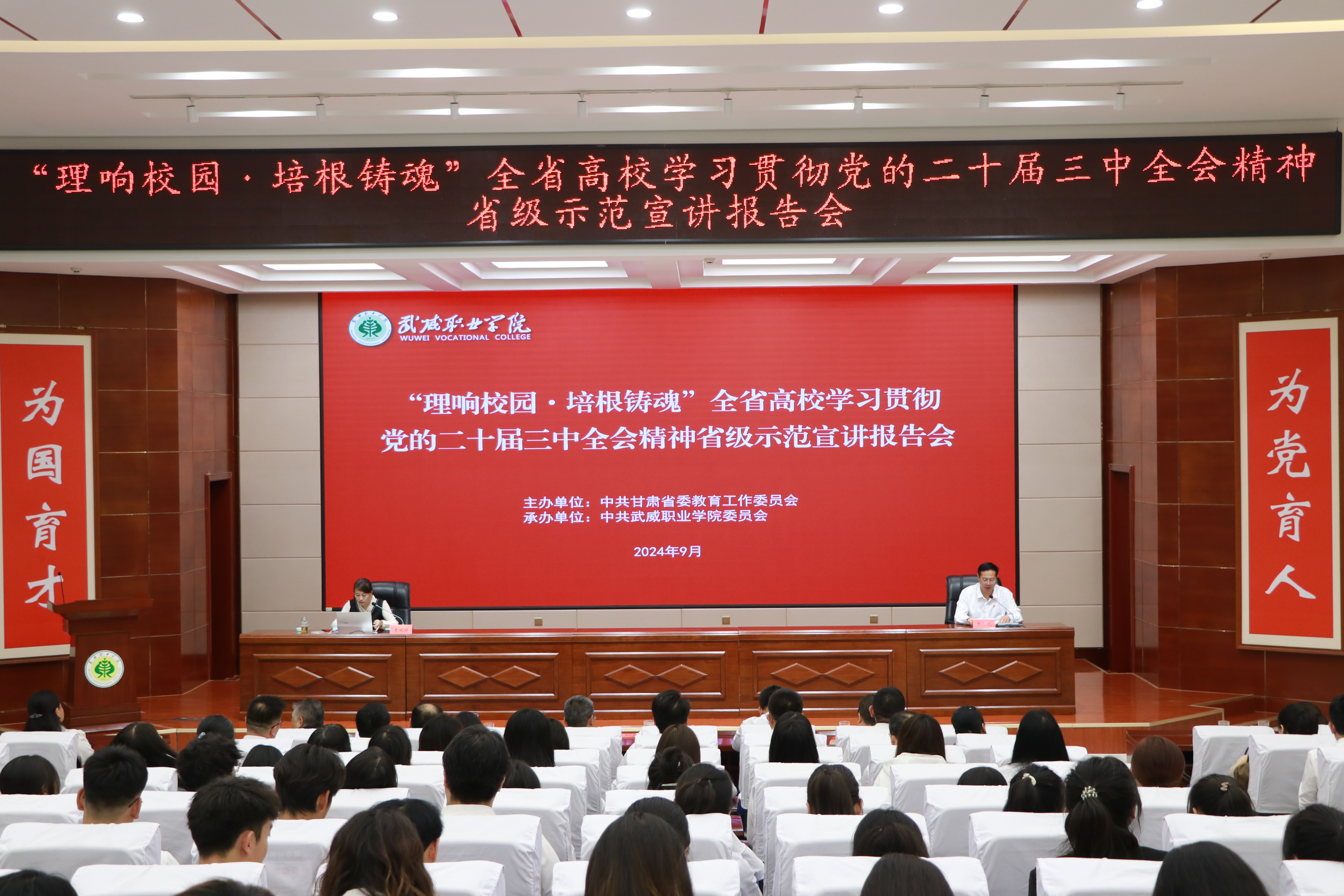 為全面深入學(xué)習(xí)宣傳貫徹黨的二十屆三中全會精神,堅持不懈用黨的創(chuàng)新理論鑄魂育人,按照省委教育工委相關(guān)安排,9月8日下午,學(xué)校在菁英廳舉辦“理響校園·培根鑄魂”全省高校學(xué)習(xí)貫徹黨的二十屆三中全會精神省級示范宣講報告會。省委教育工委宣講團成員、河西學(xué)院馬克思主義學(xué)院李婭婭副教授應(yīng)邀為我校師生作宣講報告。學(xué)校黨委班子成員、各部門、二級學(xué)院黨政負(fù)責(zé)人,教師代表,學(xué)生代表,共計220余人參加報告會。黨委副書記、校長張開禮主持報告會。