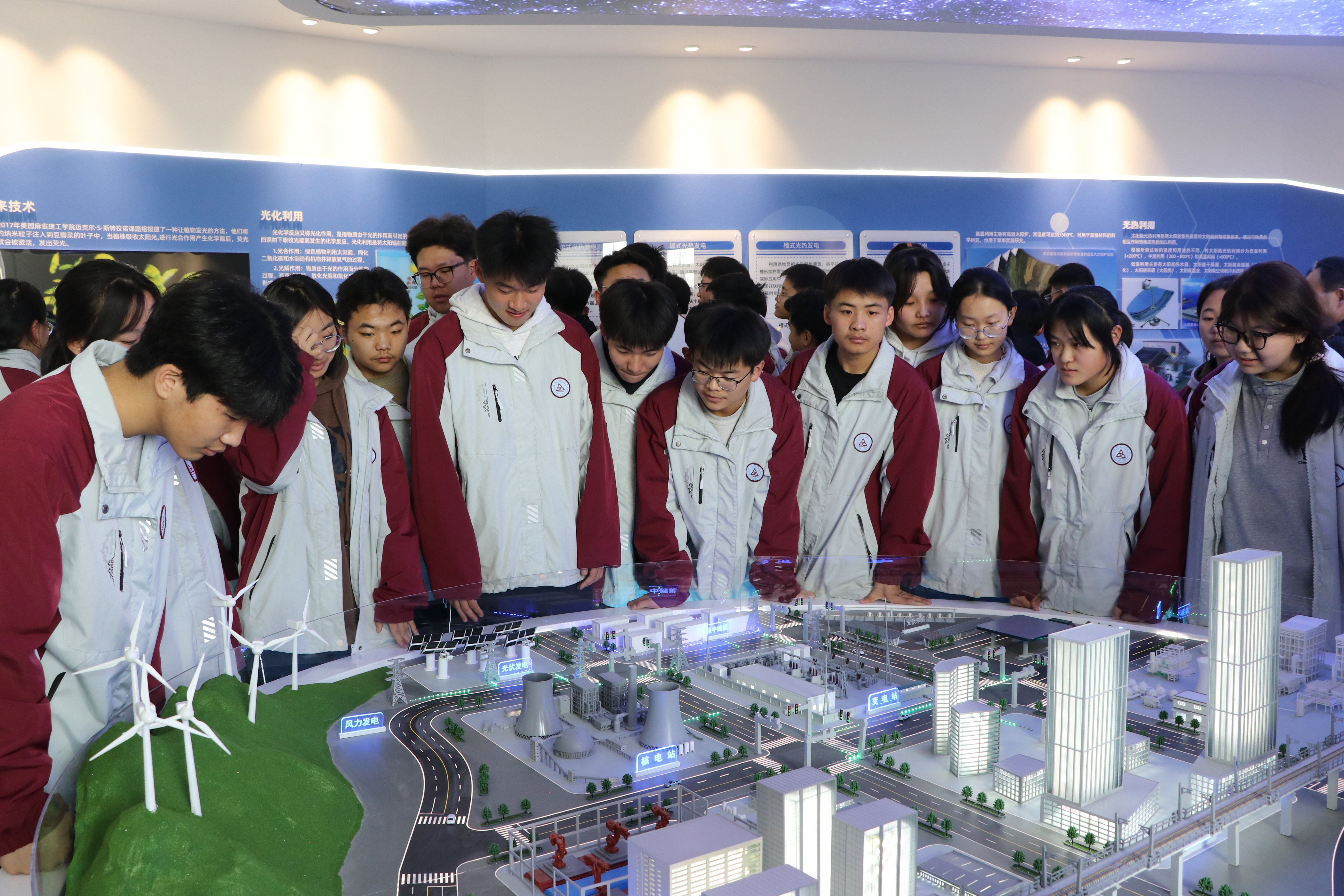 參觀活動(dòng)中,同學(xué)們興致勃勃的在“新能源科技館”中探索新能源的奧秘,體驗(yàn)參觀了光伏發(fā)電應(yīng)用、核能應(yīng)用、風(fēng)能應(yīng)用、氫能應(yīng)用等并觀看了多能互補(bǔ)沙盤(pán)演示。同學(xué)們?cè)诨顒?dòng)中觸摸科技,感受科技的無(wú)窮魅力,從而在心田播下科技之種,放飛科技成才夢(mèng)想。