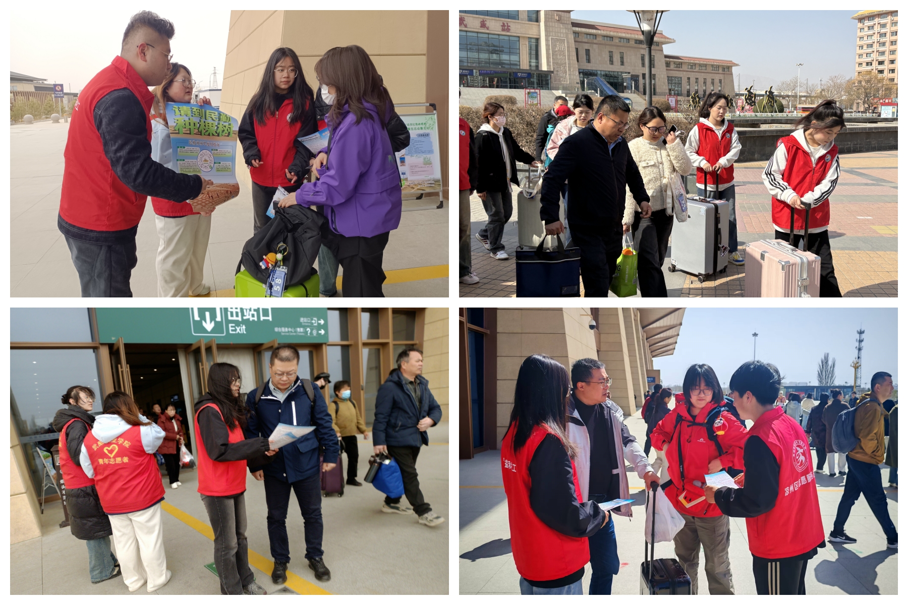助力“請到民勤種棵樹”活動。宣傳統(tǒng)戰(zhàn)部、校團(tuán)委組織志愿者在武威高鐵站、火車站、客運(yùn)中心設(shè)立志愿服務(wù)站,為前來參加“請到民勤種棵樹”活動的志愿者們提供引導(dǎo)服務(wù),詳細(xì)告知前往民勤的乘車路線、換乘信息和注意事項,協(xié)助搬運(yùn)行李,引導(dǎo)他們有序乘車。