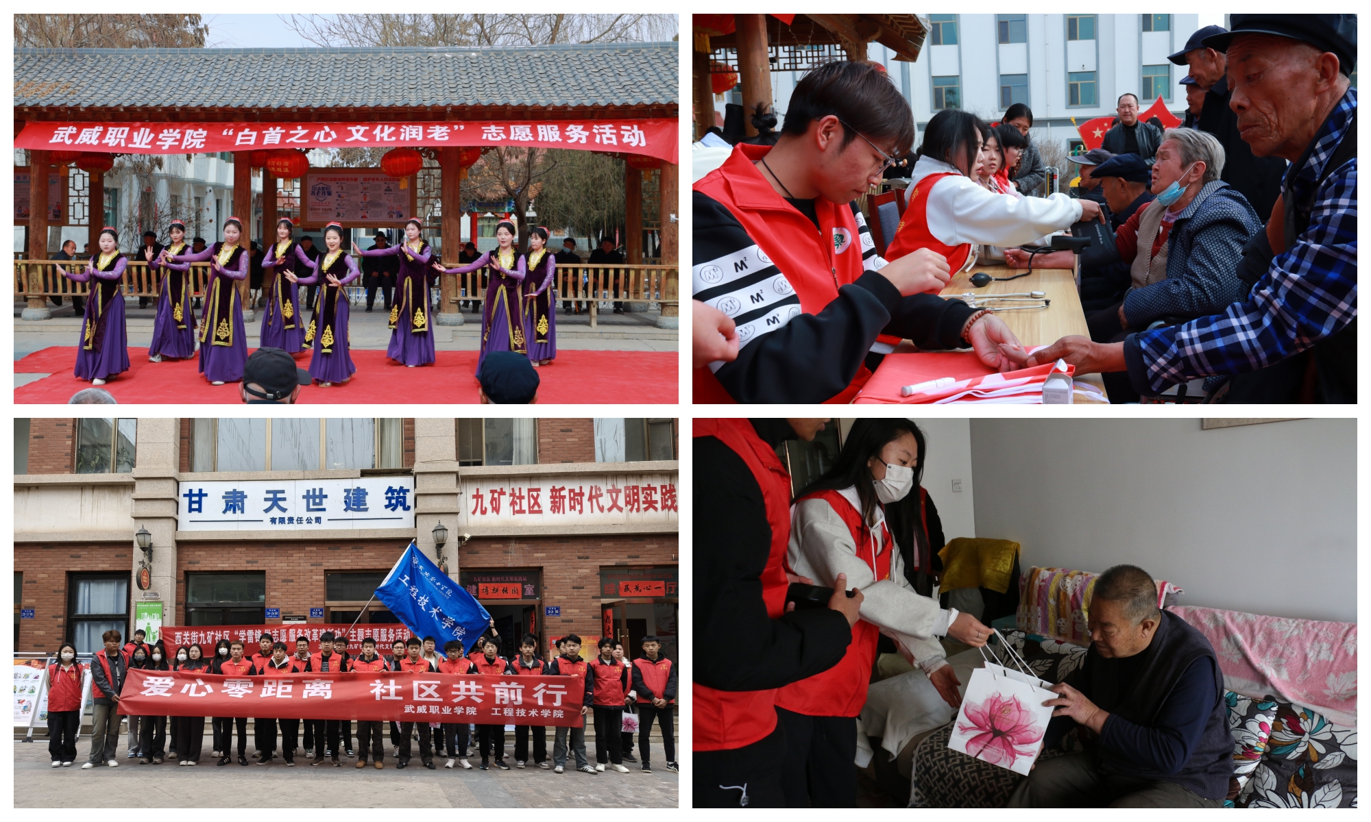 開展愛老敬老志愿服務活動。3月21日,校團委組織50余名護理和學前教育專業(yè)志愿者,前往涼州區(qū)中心敬老院開展“白首之心·文化潤老”志愿服務活動,為老人捐贈生活用品和愛心物資,開展文藝表演慰問演出,為老人測量血壓、血糖,告知在日常生活起居中的注意事項,以專業(yè)技能守護老人健康。3月5日,工程技術學院35名志愿者走進西關街九條嶺礦區(qū)社區(qū),開展“愛心零距離社區(qū)共前行”志愿服務活動,為社區(qū)孤寡老人、獨居老人和老黨員等特殊家庭送上慰問品,打掃衛(wèi)生、擦拭家具,幫忙照料綠植,并與社區(qū)工作者一起規(guī)范擺放社區(qū)內亂停亂放的自行車、電動車,清潔窗戶、地面,營造整潔有序的社區(qū)環(huán)境。