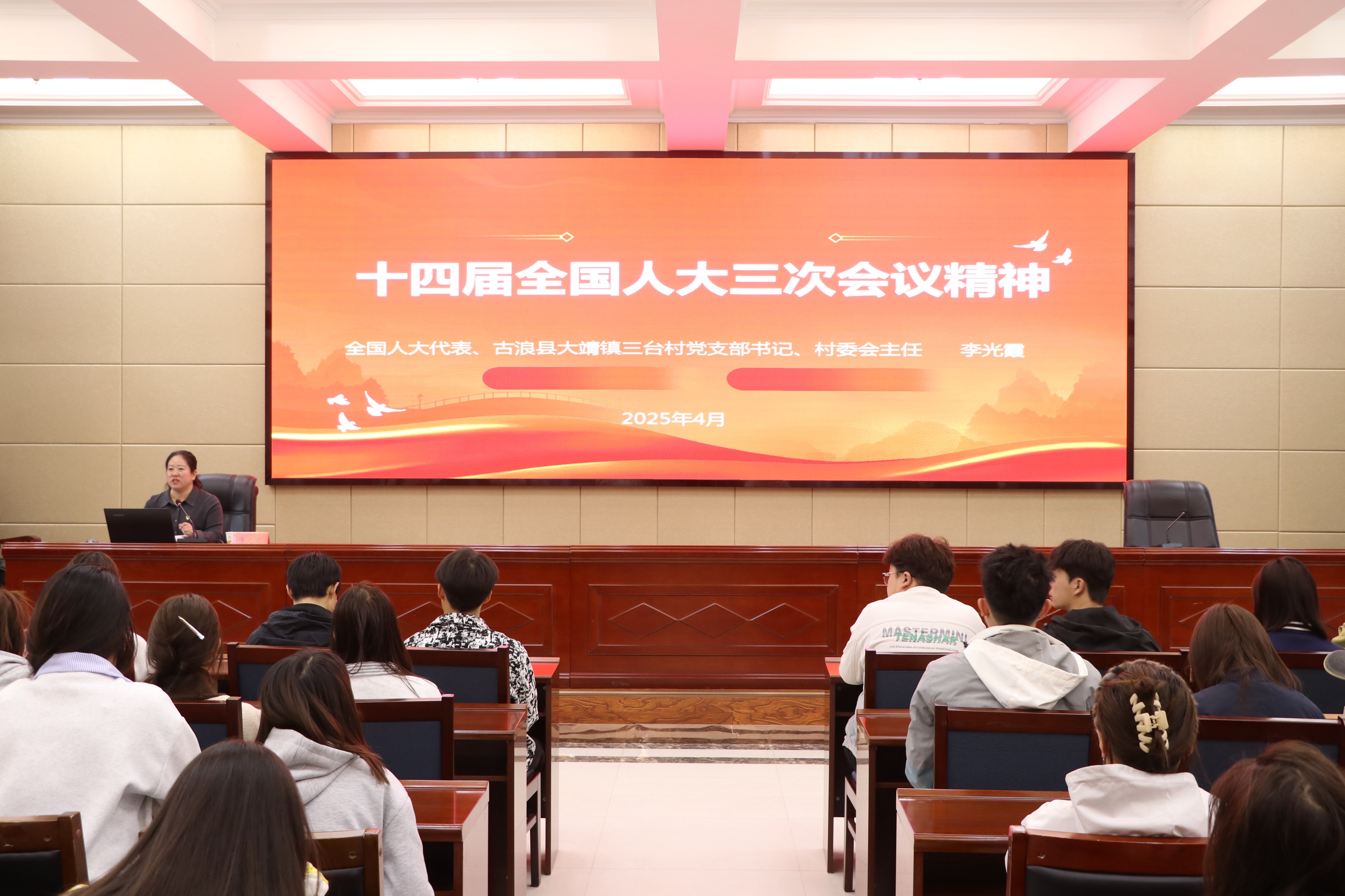 為全面深入學習領會習近平總書記在全國兩會期間發(fā)表的系列重要講話精神和全國兩會審議通過的報告和文件精神,根據省委教育工委關于舉辦“理響校園·培根鑄魂”全國兩會精神示范性宣講活動的通知,4月16日,全國兩會精神省級示范宣講團成員、武威市古浪縣大靖三臺村黨支部書記兼村委會主任、十四屆全國人大代表李光霞應邀來校作宣講報告。學校師生代表共200余人聆聽了報告。