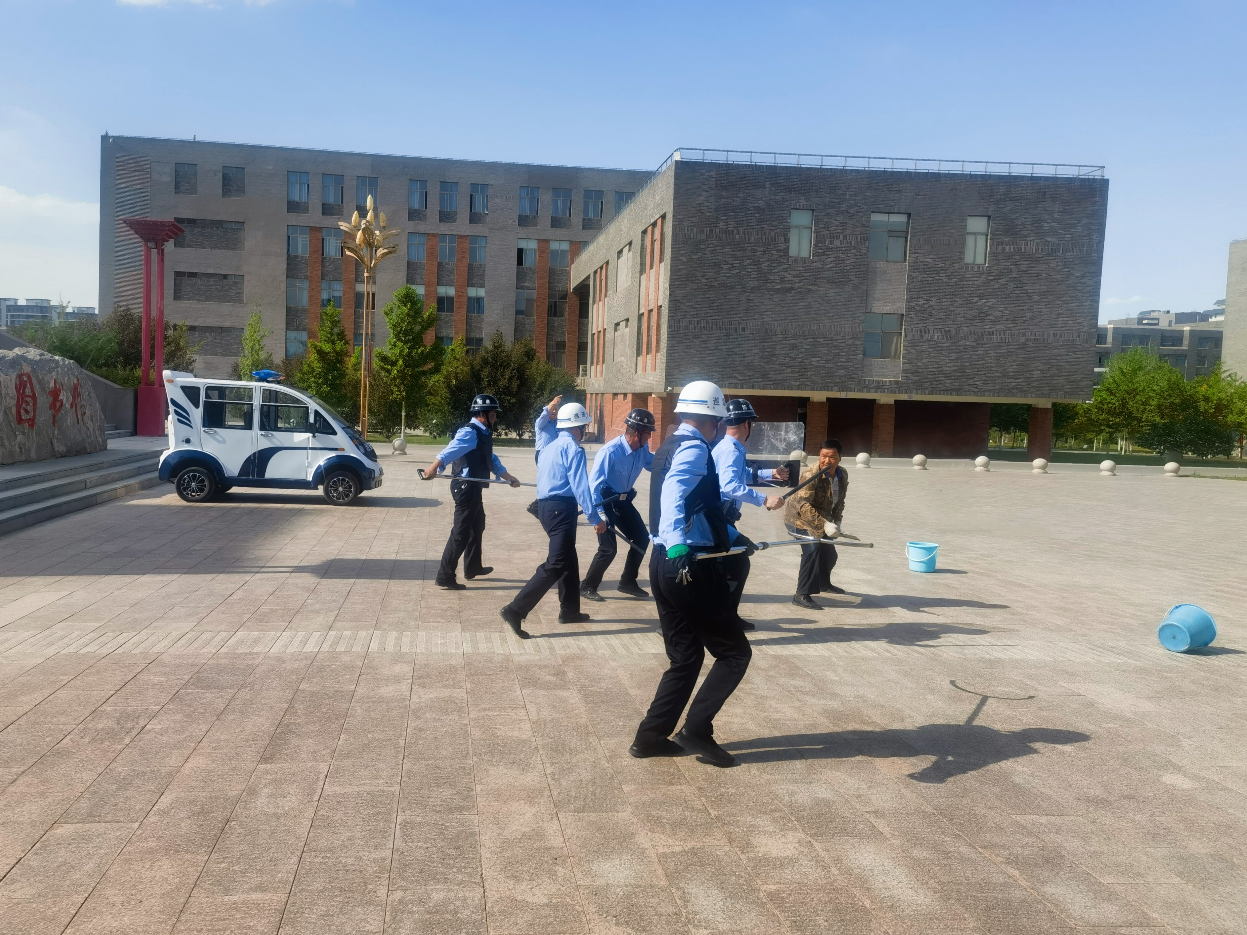 為進一步增強師生反恐防暴意識,提升安保人員應(yīng)急處置能力,筑牢校園安全防線,5月15日,學校安全保衛(wèi)處聯(lián)合轄區(qū)派出所在圖書館東側(cè)廣場組織開展了反恐防暴應(yīng)急演練。