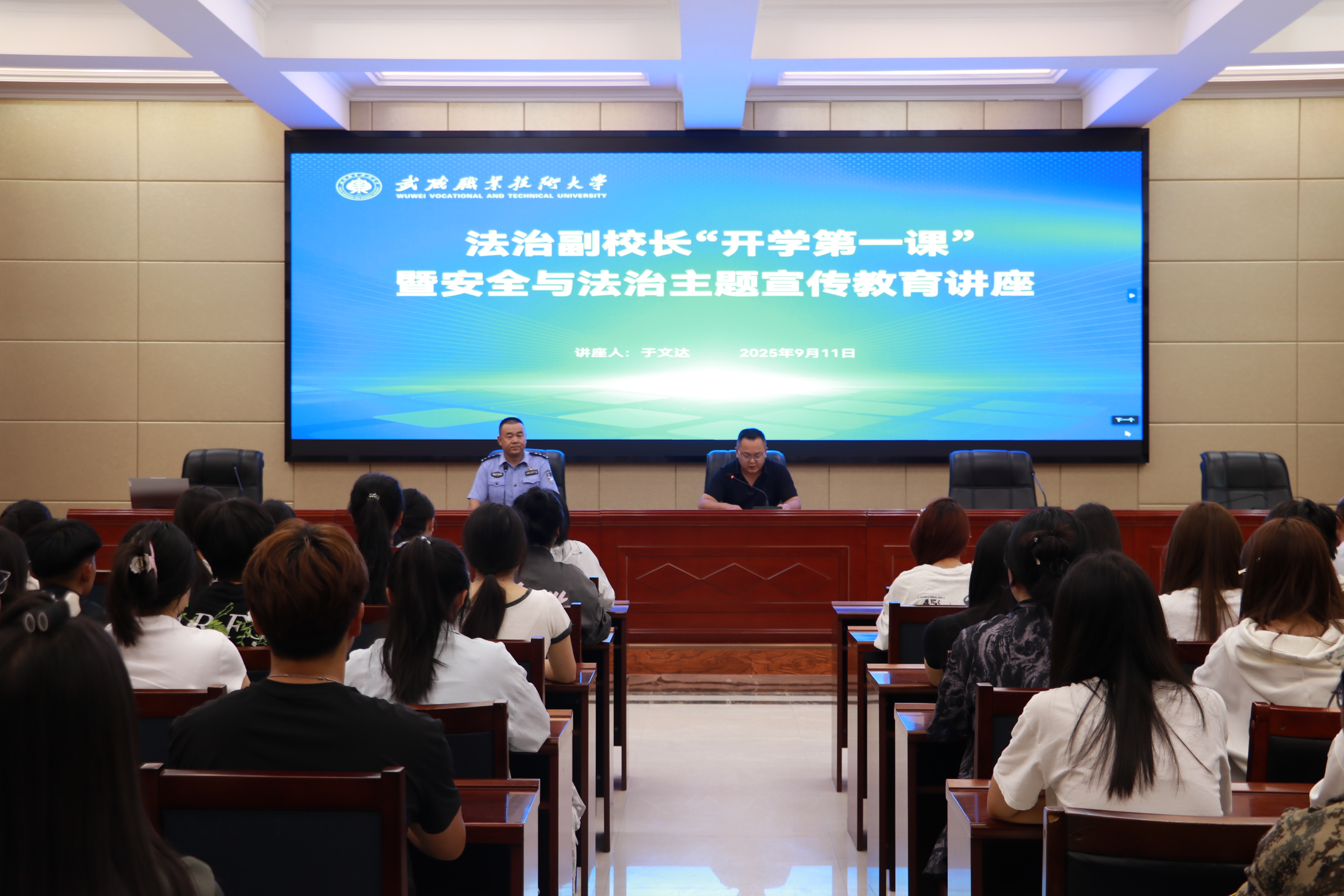 為加強(qiáng)師生法治觀念,提高安全意識(shí),9月11日,學(xué)校安全保衛(wèi)處邀請(qǐng)法治副校長(zhǎng)于文達(dá)為學(xué)校師生講授2025年秋季學(xué)期“開學(xué)第一課”,開展安全與法治教育專題講座?;顒?dòng)在行樹樓北側(cè)報(bào)告廳舉行,活動(dòng)由安全保衛(wèi)處副處長(zhǎng)康興奎主持。