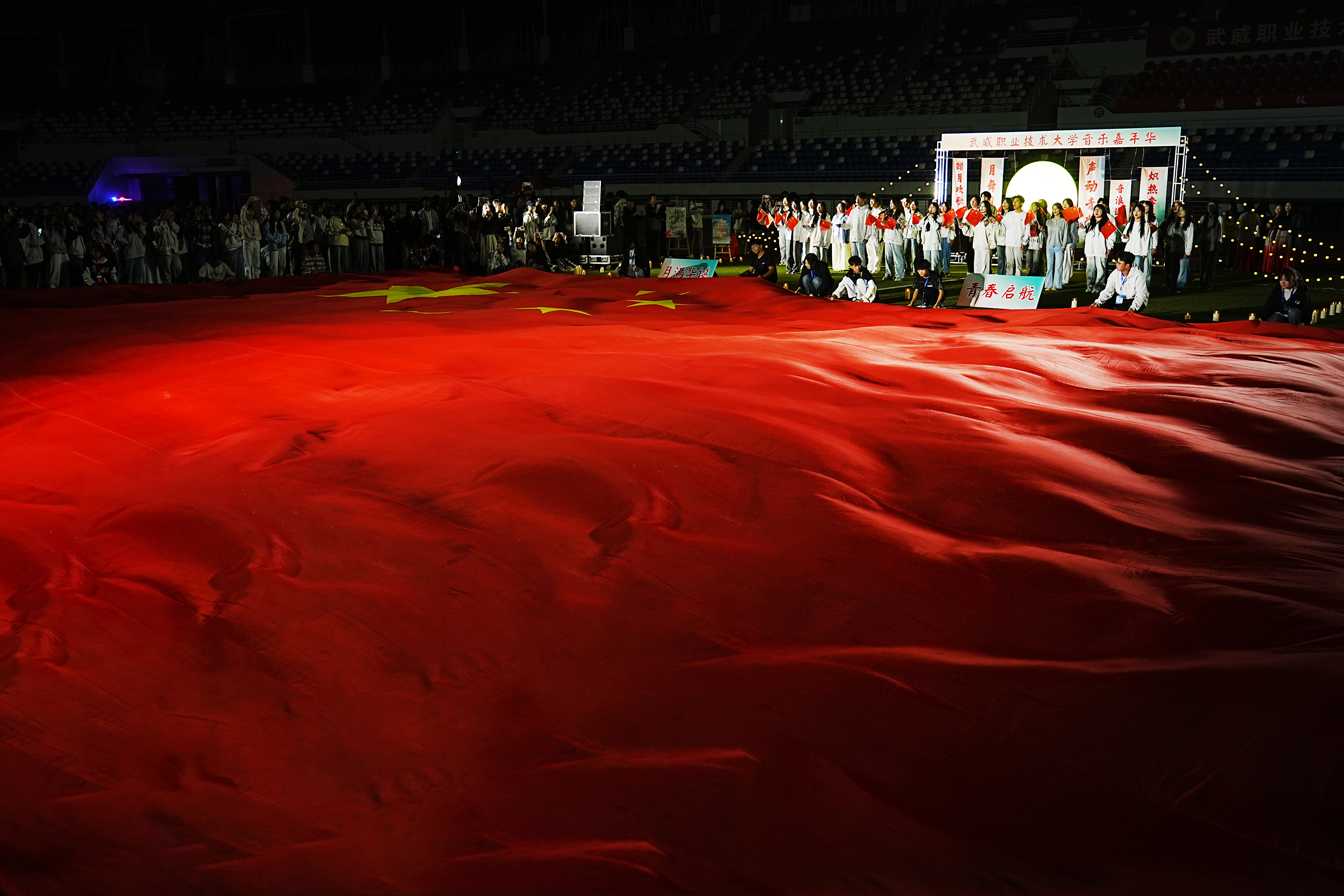 活動尾聲,在深情的旋律中,演職人員與觀眾齊聲合唱《如愿》,深切表達(dá)對國泰民安的美好祝愿。巨幅國旗在師生手中緩緩傳遞、飄揚(yáng)舞動,匯成一片莊嚴(yán)而溫暖的紅色海洋,將現(xiàn)場氛圍推向最高潮,展現(xiàn)出青年一代與時代同頻、與祖國同行的堅(jiān)定信念。