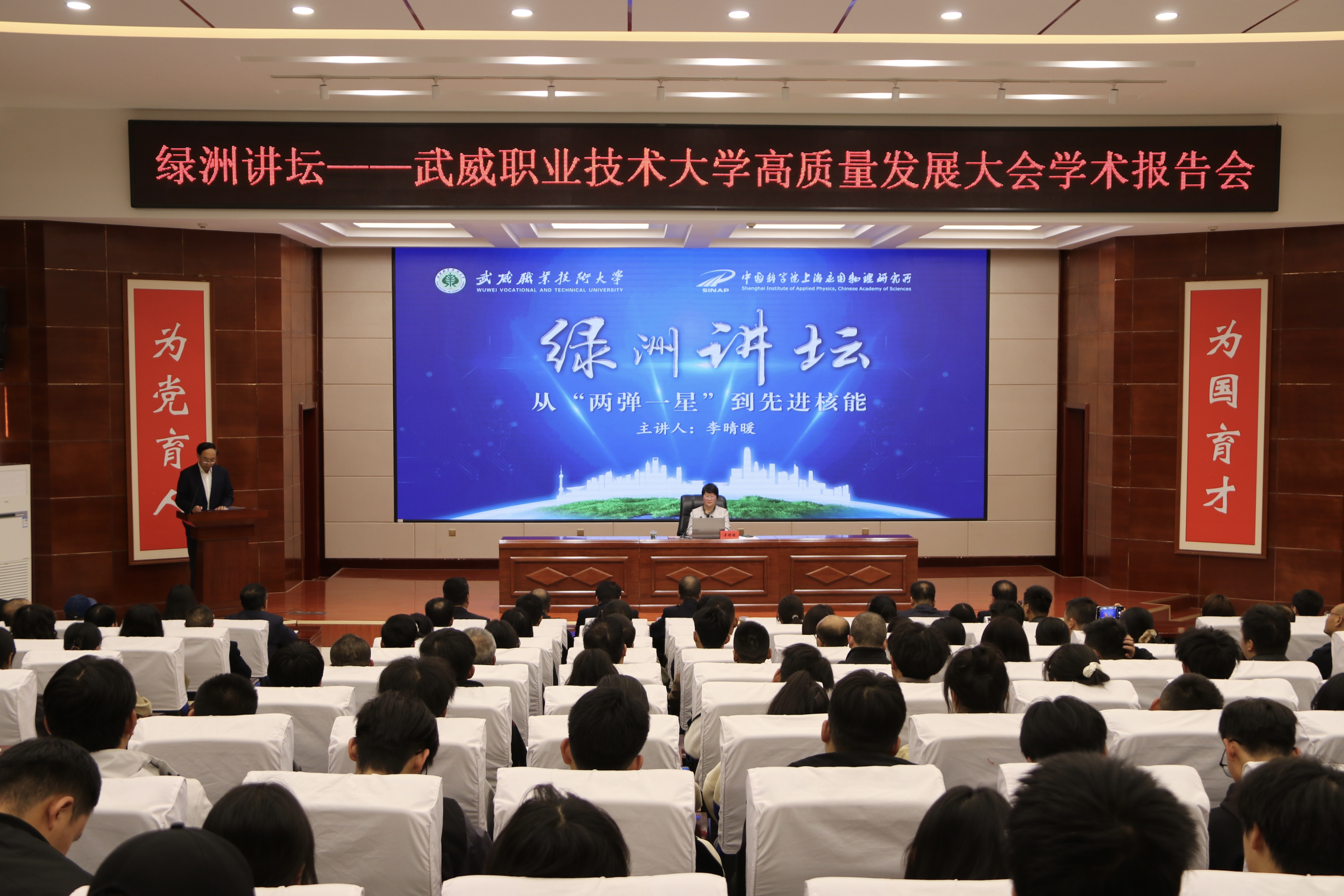 當天上午,武威職業(yè)技術(shù)大學舉行揭牌儀式,標志著學校正式邁入發(fā)展新階段。而學校的跨越式發(fā)展,離不開上海應(yīng)用物理研究所的長期支持。自2018年2月,甘肅省教育廳、武威市政府與上海應(yīng)用物理研究所簽訂《聯(lián)合辦學協(xié)議》,共建“中科低碳新能源技術(shù)學院”以來,雙方開創(chuàng)了中科院研究所與高職院校合作辦學先例,成為全國產(chǎn)教融合、科教融匯典范。在上海應(yīng)用物理研究所助力下,武威職業(yè)技術(shù)大學打造的 “綠洲講壇” 系列活動,圍繞政治、經(jīng)濟、文化、社會熱點等領(lǐng)域開展學術(shù)講座,不僅拓展了師生視野,更營造了優(yōu)良學術(shù)氛圍,成功獲評甘肅省職業(yè)院校特色文化品牌。