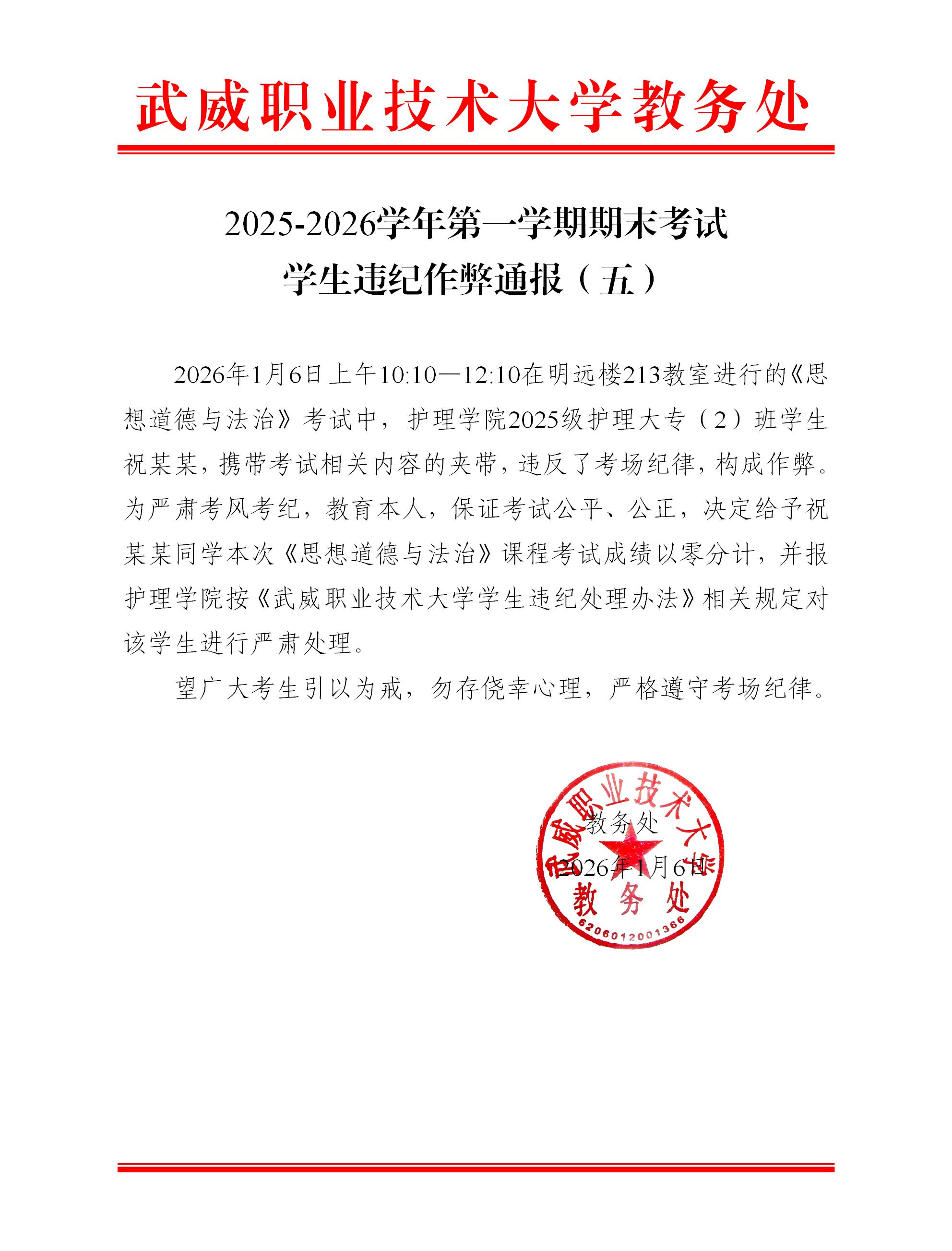 2025-2026學年第一學期期末考試學生違紀作弊通報(五)
