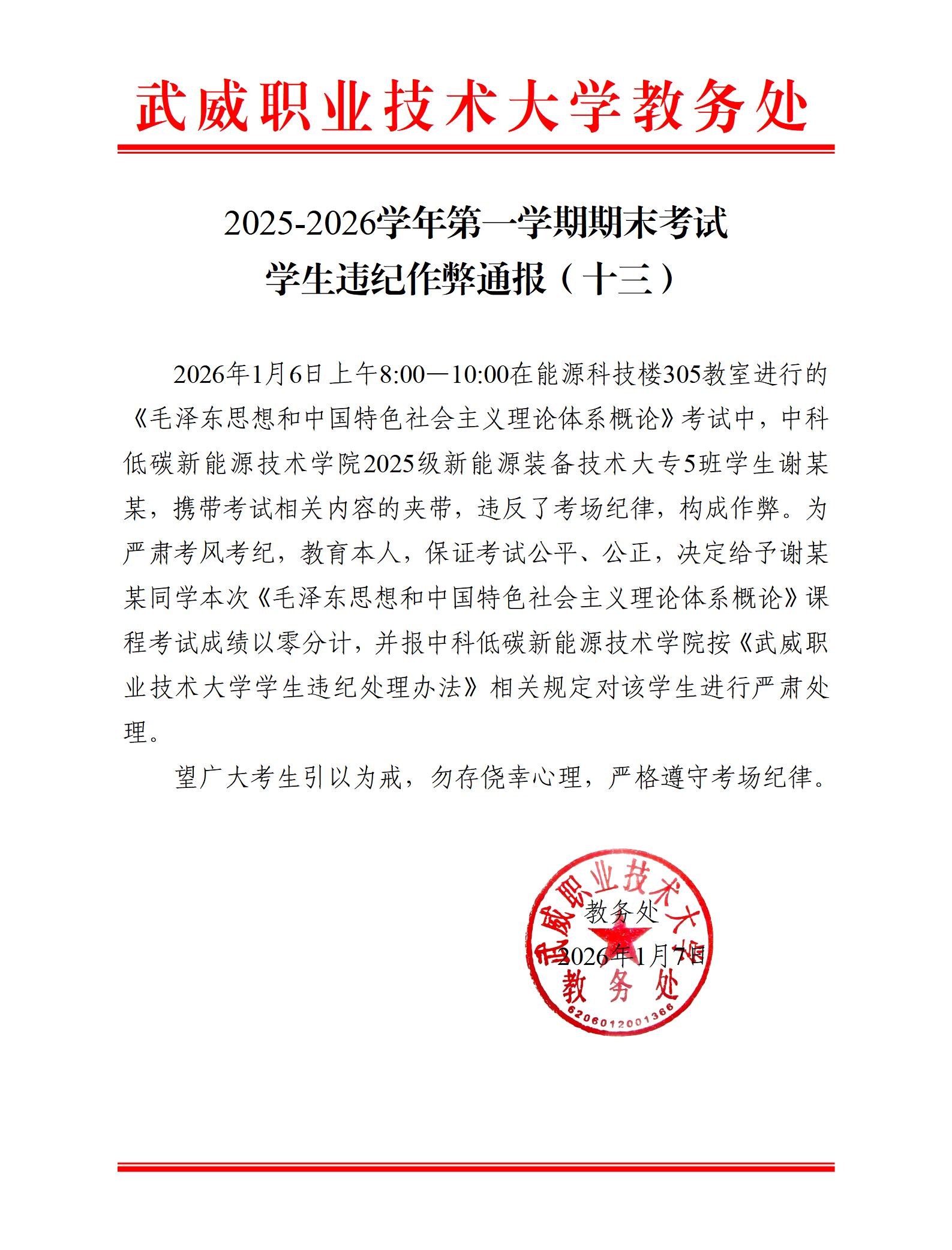 2025-2026學(xué)年第一學(xué)期期末考試學(xué)生違紀作弊通報(十三)