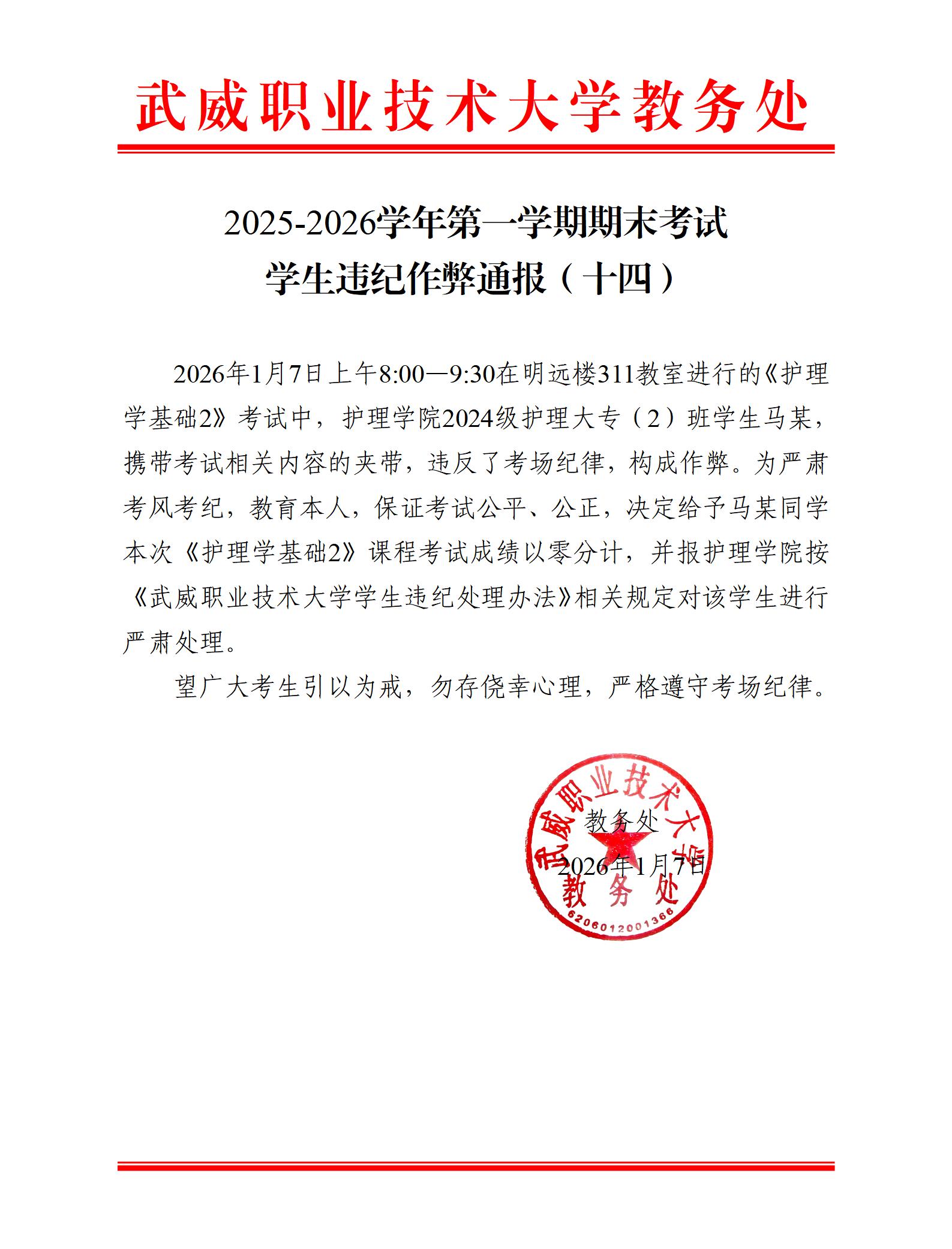 2025-2026學(xué)年第一學(xué)期期末考試學(xué)生違紀(jì)作弊通報(十四)