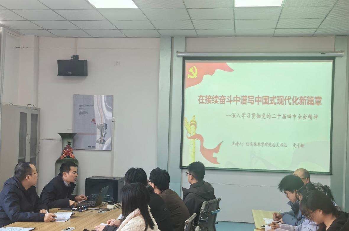 為深入學(xué)習(xí)貫徹黨的二十屆四中全會(huì)精神,引導(dǎo)學(xué)院教師深刻把握其重大意義與核心要義,凝聚奮進(jìn)力量,近日,信息技術(shù)學(xué)院黨總支書記為全體教師講授了題為“在接續(xù)奮斗中譜寫中國式現(xiàn)代化新篇章”的專題黨課。