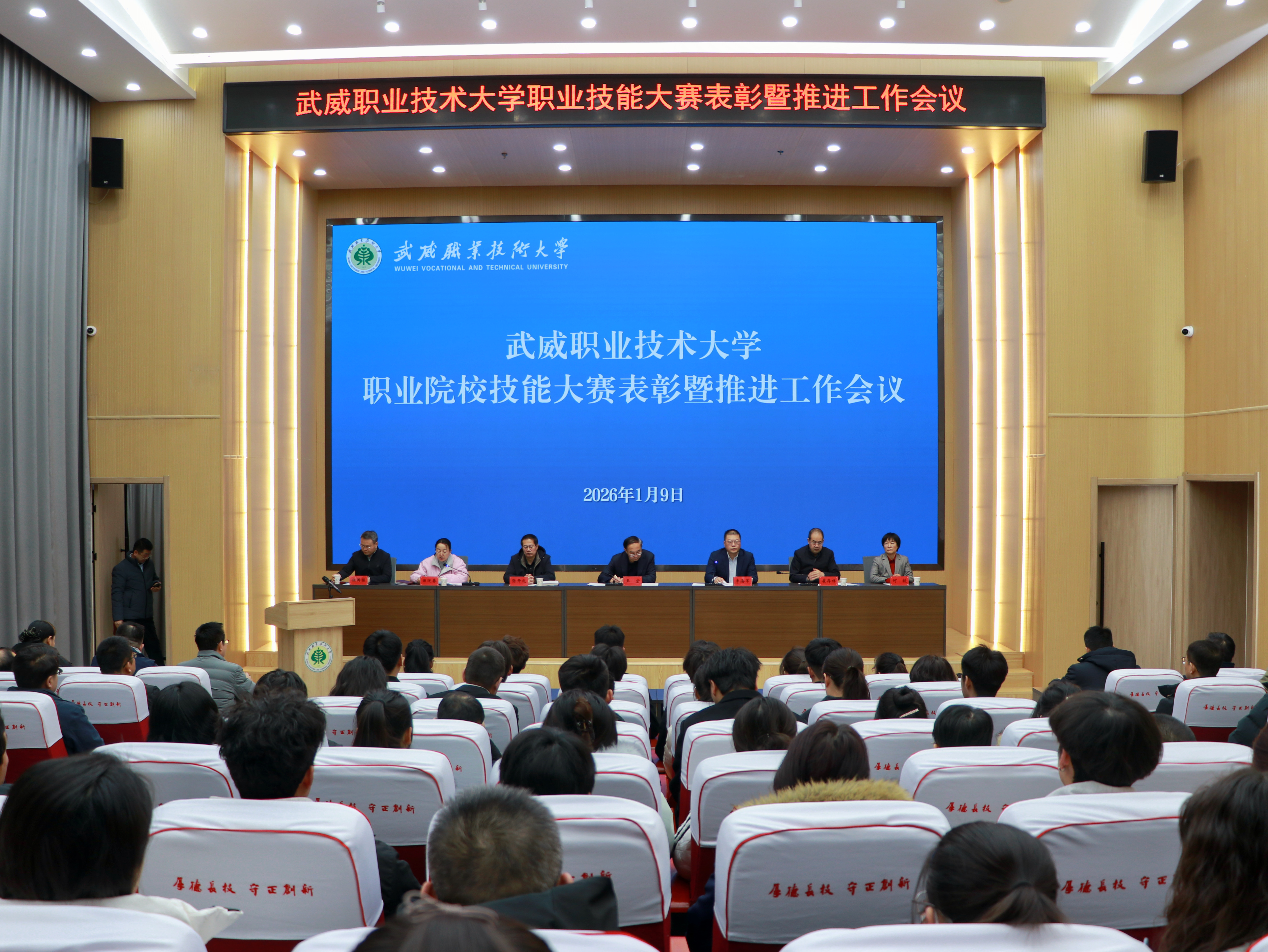 1月9日,武威職業(yè)技術(shù)大學(xué)召開職業(yè)院校技能大賽表彰暨推進(jìn)工作會議。黨委書記王宏出席會議并講話。在家校領(lǐng)導(dǎo)班子成員、各學(xué)院(部)及職能部門負(fù)責(zé)人、獲獎師生代表以及備戰(zhàn)2026年大賽的師生代表共同參會。校長李海軍主持會議。
