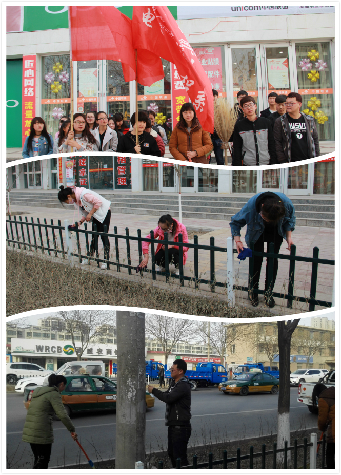 電子信息工程系團總支結(jié)合團市委、院團委《關(guān)于開展城鄉(xiāng)環(huán)境衛(wèi)生整治青年志愿服務(wù)活動的通知》安排,3月3日下午16:30組織20名團員青年在學(xué)院北門口道路兩側(cè)開展了衛(wèi)生死角清掃,柵欄清潔,果皮箱清潔,公交站臺清潔,小廣告清理,垃圾清運。學(xué)生志愿者盡己所能,服務(wù)社會,傳播勞動信念,為建設(shè)美好社會貢獻自己的一份微薄力量。