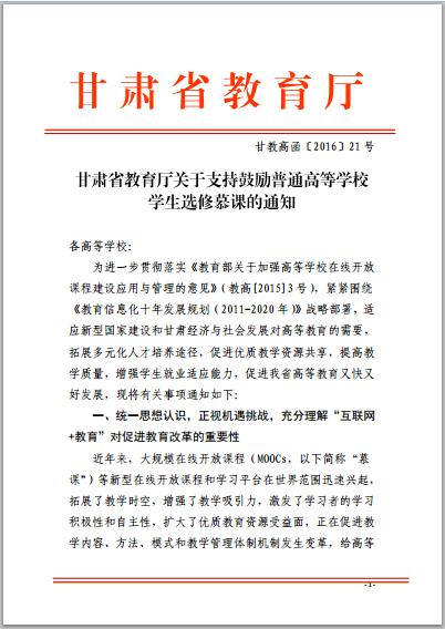甘肅省教育廳關(guān)于支持鼓勵普通高等學(xué)校學(xué)生選修慕課的通知