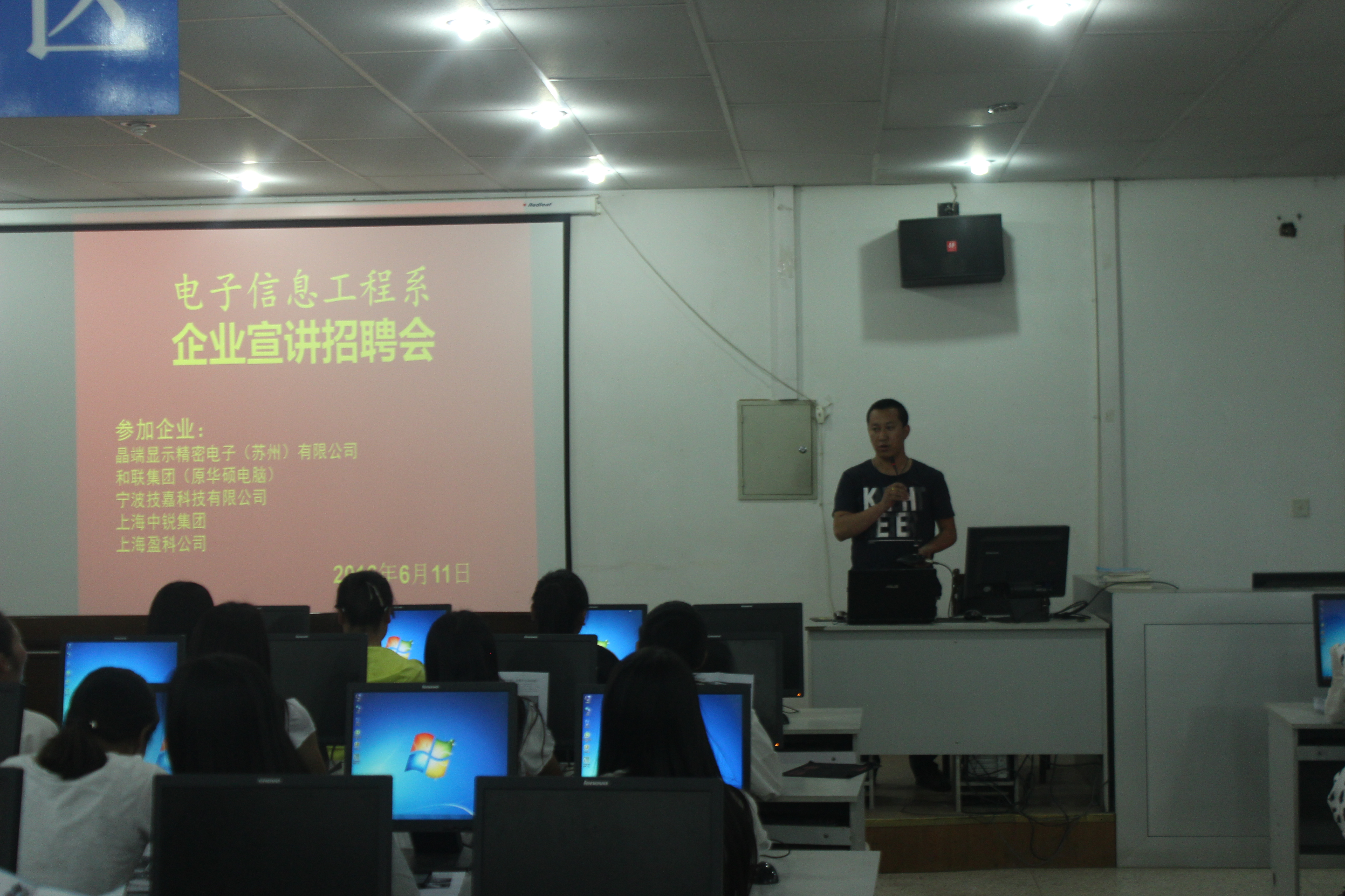為更好的做好2014級(jí)學(xué)生頂崗實(shí)習(xí)的工作,6月11日,電子信息工程系在學(xué)院十號(hào)機(jī)房舉辦了企業(yè)專場(chǎng)招聘會(huì),2014級(jí)全體學(xué)生參加了招聘會(huì)。參會(huì)的五家企業(yè)是:晶端顯示精密電子(蘇州)有限公司、上海中銳集團(tuán)、寧波技嘉科技有限公司、和聯(lián)集團(tuán)(原華碩電腦)和上海電訊盈科公司。
