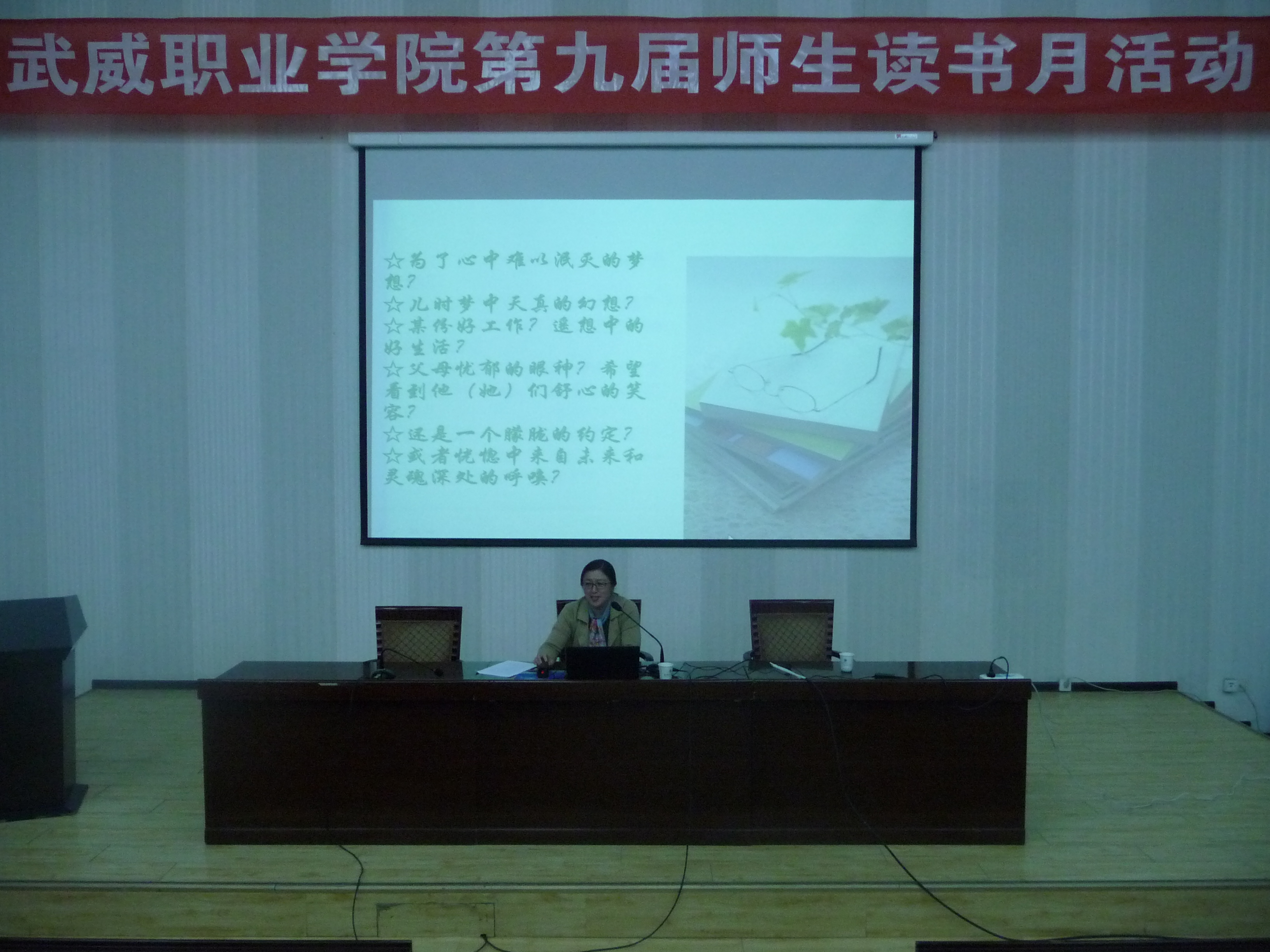 為在全院師生中營造良好的讀書氛圍,豐富校園文化生活,在第22個(gè)世界讀書日來臨之際,4月20日,武威職業(yè)學(xué)院第九屆讀書月活動(dòng)專題講座在正德廳舉行。學(xué)院中文專業(yè)副教授、電子信息工程系主任李亞梅應(yīng)邀進(jìn)行了《為何而讀書》的專題講座,近300名師生參加了此次講座。