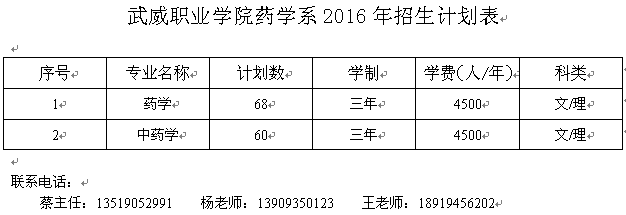 武威職業(yè)學(xué)院藥學(xué)系2016年招生計劃