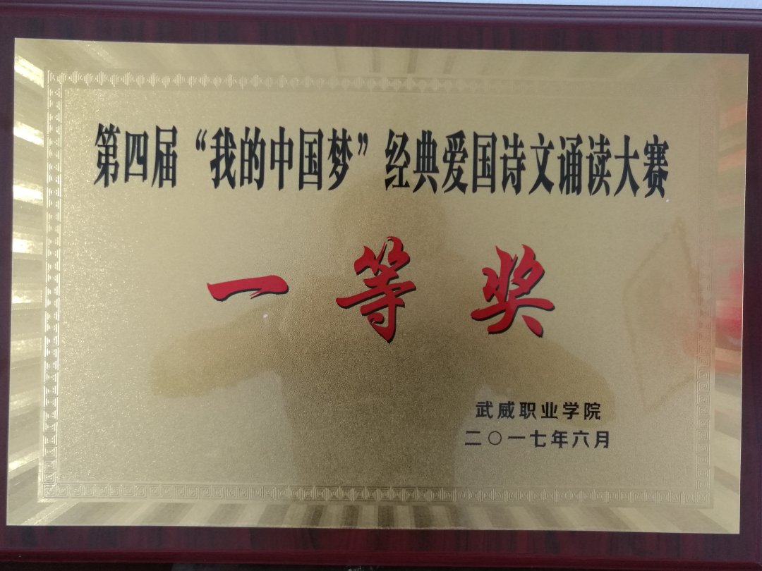 為進一步推進優(yōu)質(zhì)校建設(shè),加強學(xué)生思想素質(zhì)修養(yǎng),豐富學(xué)生課余文化生活,提高學(xué)生精神文明建設(shè),我系選派由15學(xué)10曹智娟,李濤濤,15學(xué)4王菲,16動漫林露組成的參賽隊參加武威職業(yè)學(xué)院第四屆愛國詩文朗誦比賽決賽,比賽在學(xué)院正德廳舉行,我系參賽作品《她在云中笑》榮獲決賽一等獎。同時,對推進學(xué)院優(yōu)質(zhì)校建設(shè)做出更大的努力。