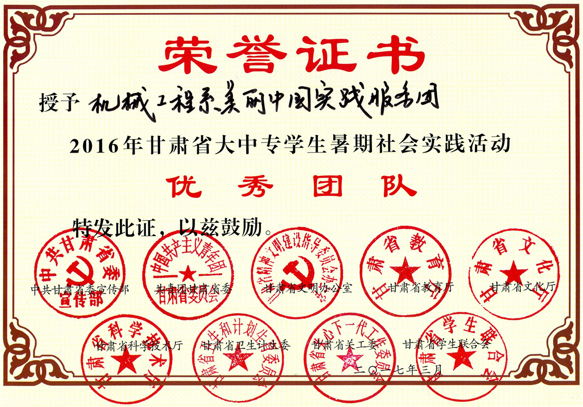 甘肅省大中專學(xué)生暑期社會實(shí)踐活動優(yōu)秀團(tuán)隊(duì)---機(jī)械制造系美麗中國實(shí)踐服務(wù)團(tuán)