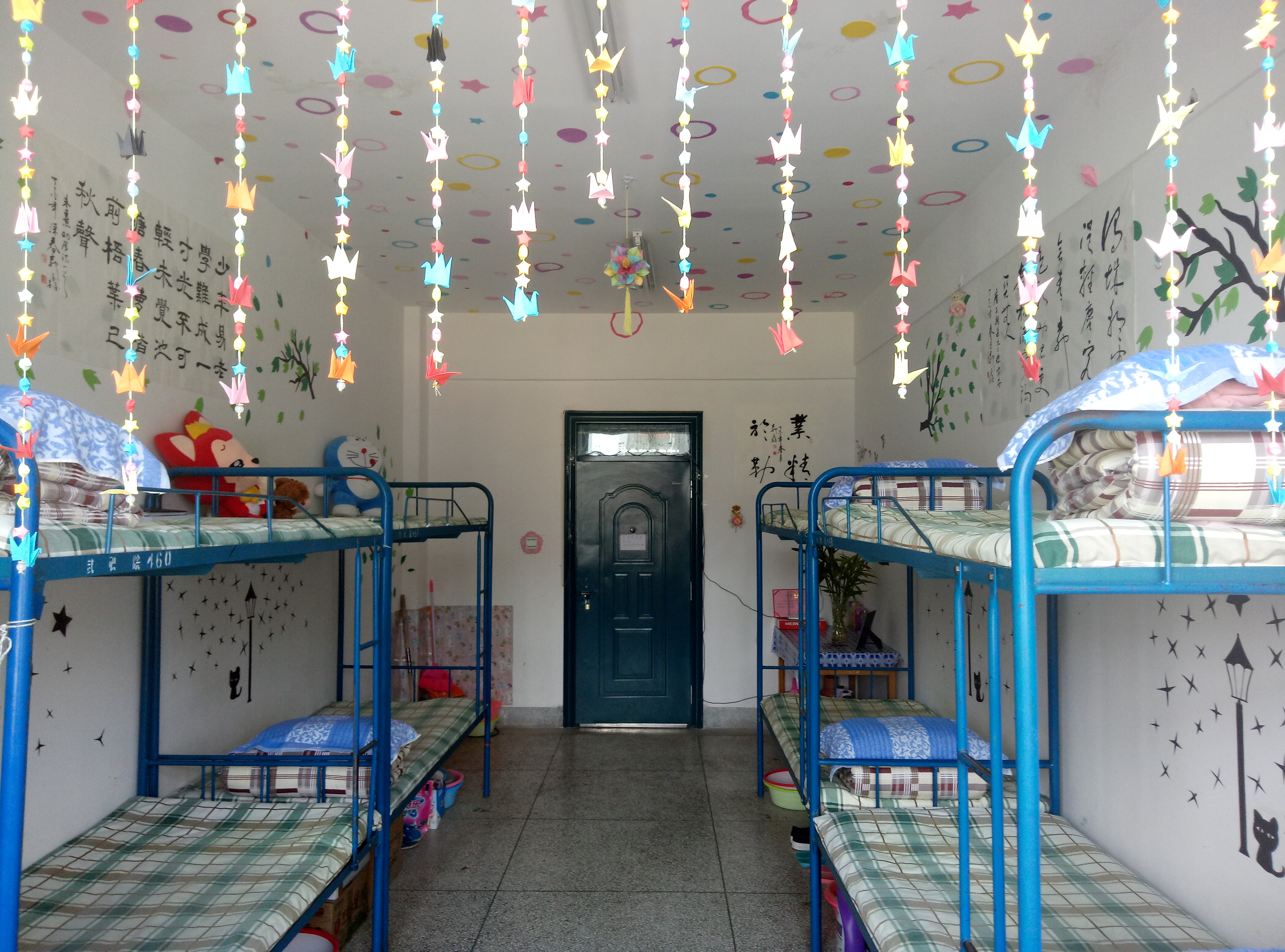 各宿舍衛(wèi)生狀況普遍較好,基本做到了勤開(kāi)窗,勤掃除,被褥疊放整齊,地面、桌面干凈整潔,用電合理、安全。同學(xué)們大膽創(chuàng)新利用剪紙、剪花、圖貼等手工作品將宿舍裝扮得優(yōu)雅而漂亮。也有同學(xué)用書法、繪畫作品裝扮宿舍,為宿舍增添了藝術(shù)的氣息。