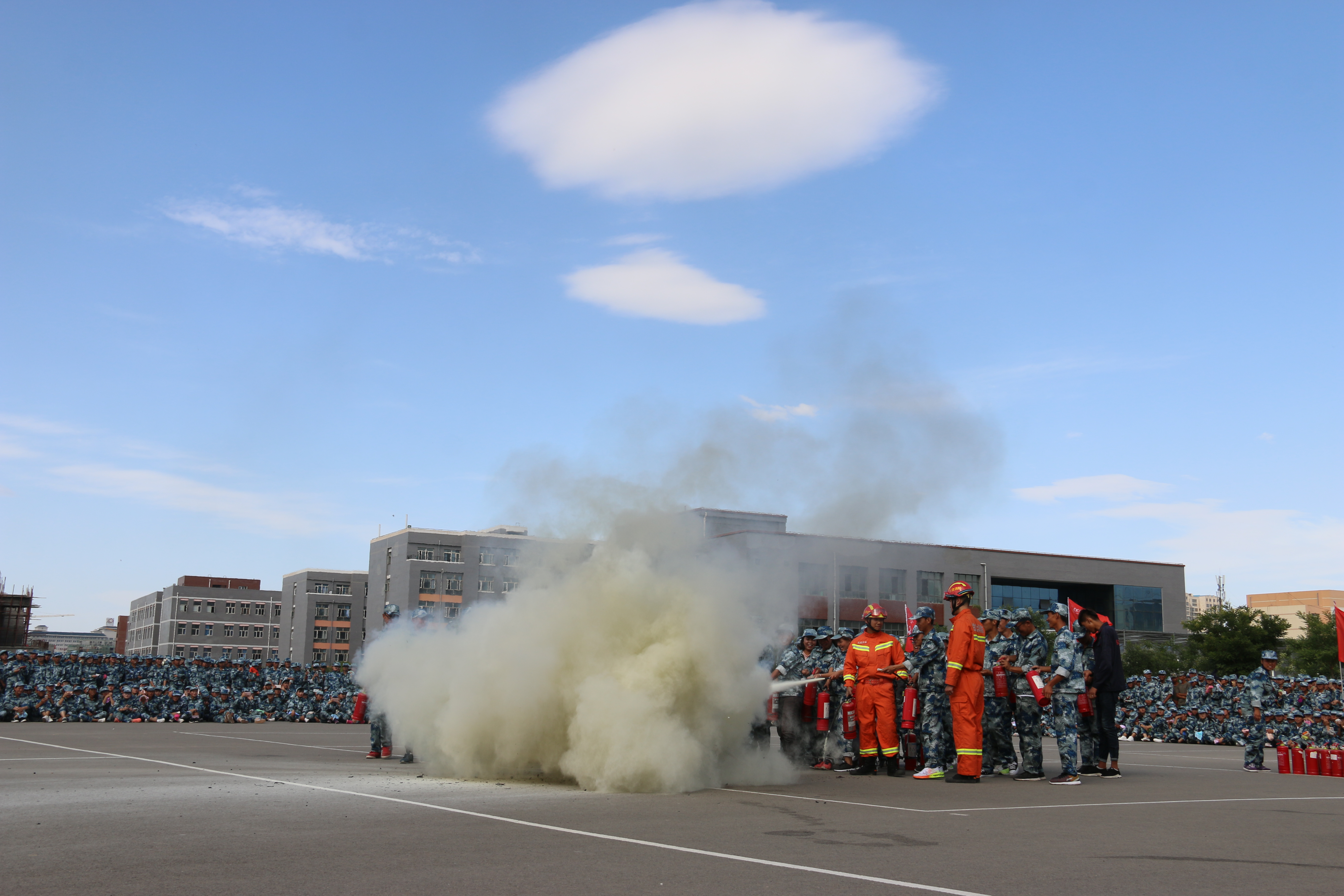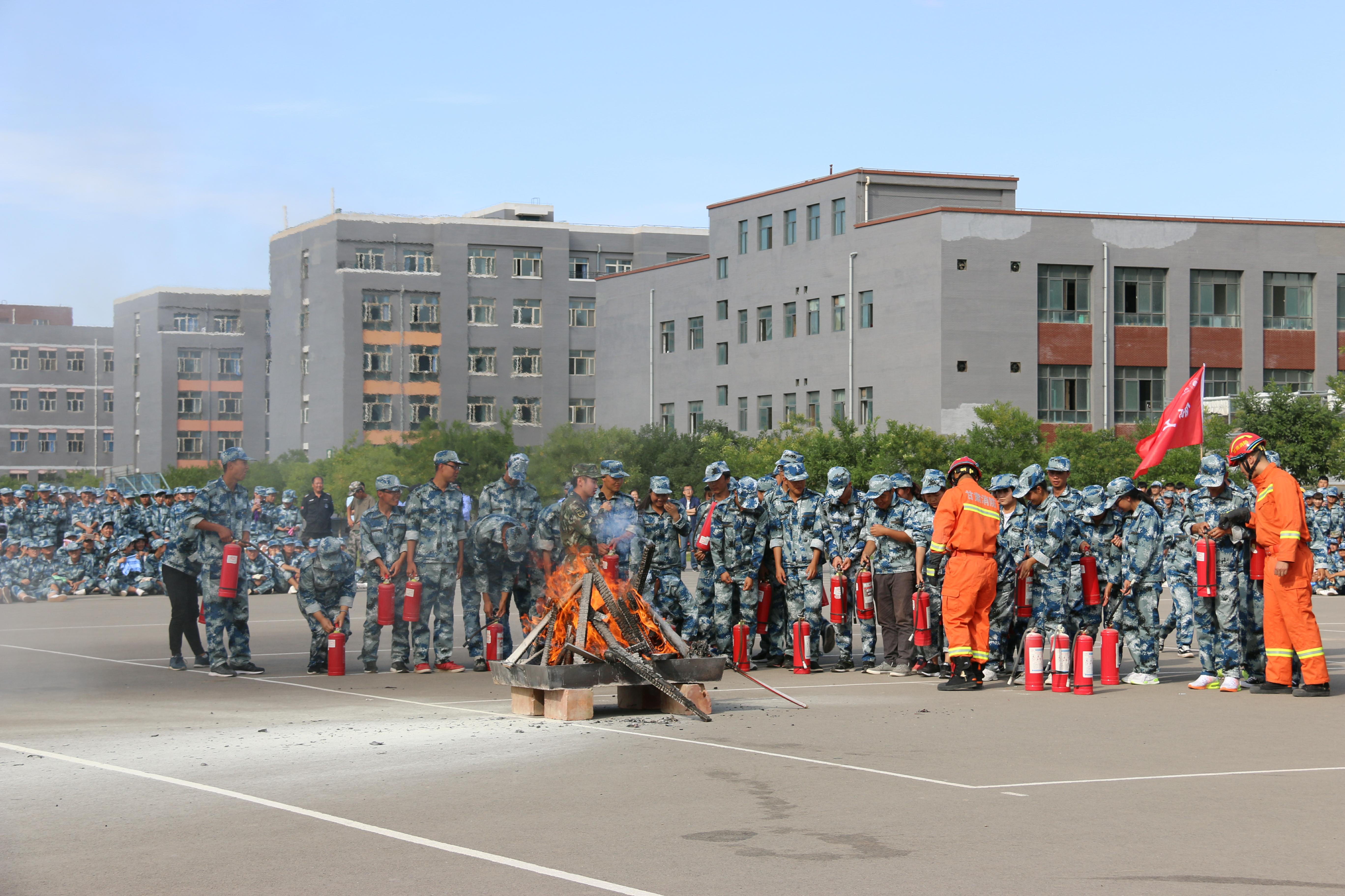 隨后,所有參演學(xué)生整隊到操場參加了滅火演練。在消防官兵的講解和和示范下,同學(xué)們體驗了處置著火液化氣瓶、干粉滅火器滅火,通過模型煙室等操作。
