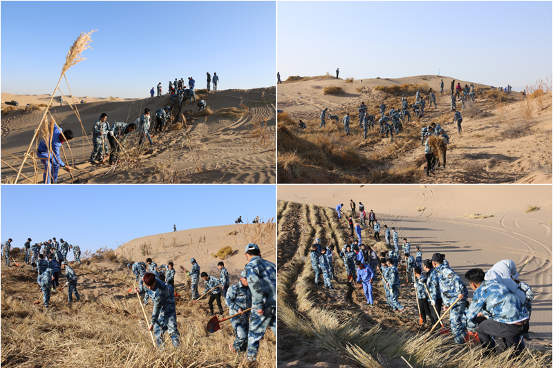 在勞動(dòng)現(xiàn)場,學(xué)院領(lǐng)導(dǎo)和師生們不畏冬寒,分工協(xié)作,按照標(biāo)準(zhǔn)和要求劃線開溝、蒲草培沙、等距離推進(jìn),現(xiàn)場一片熱火朝天的景象。荒蕪的沙地身披新衣,整齊的稻草方格逐漸向遠(yuǎn)處的沙丘覆蓋。